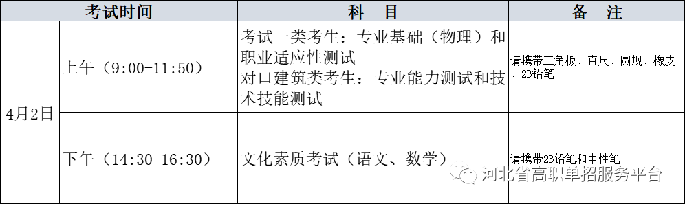 考生请于3月29日9时—4月2日17时登录单招平台(http://hebgzdz.sjziei.com)打印准考证。考生须持准考证、身份证等有效证件和所需考试用品按时到达指定地点进行考试。