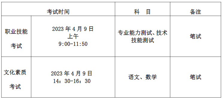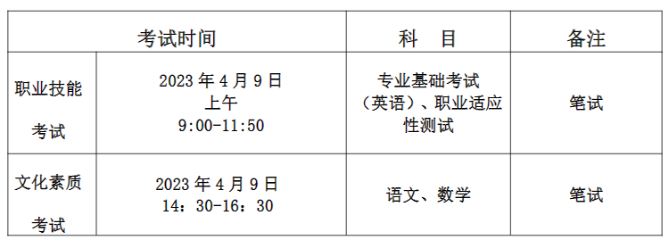 考试科目为语文、数学两科,每科150分,满分300分,考试时间共120分钟,考试形式为笔试,采取合卷考试方式,实行客观题型机读卡作答模式进行。报考考试六类的考生,文化素质考试成绩使用普通高中学业水平合格性考试(以下简称学考)中语文和数学科目的成绩折算代替。对应分值为:A--130分;B--110分;C--90分;D--70分;E--50分;没有语文和数学学考成绩或者语文、数学学考成绩不全的考生,须参加文化素质考试,如不参加文化素质考试,文化素质考试成绩为零。
