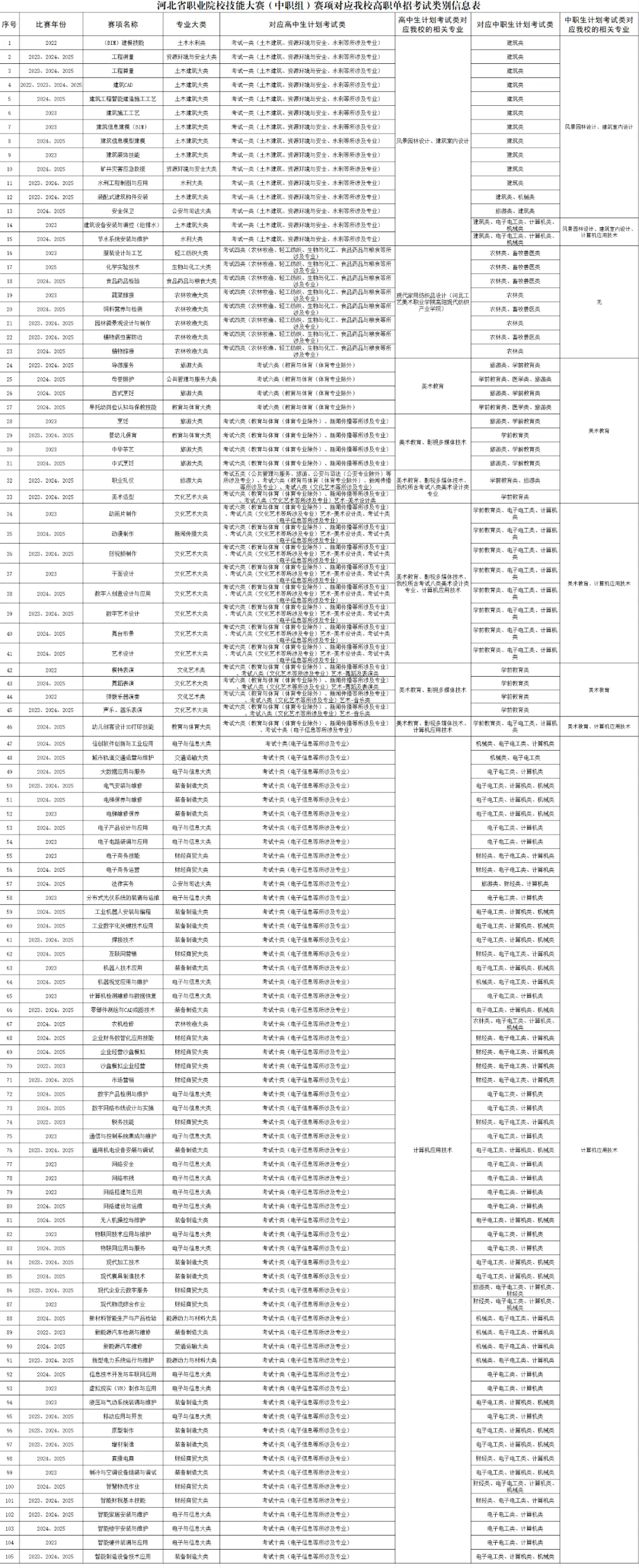 成绩公布时,赋分后的成绩和其他考生一起公布,河北省职业院校技能大赛(中职组)赛项对应我校高职单招考试类别信息表见下表。