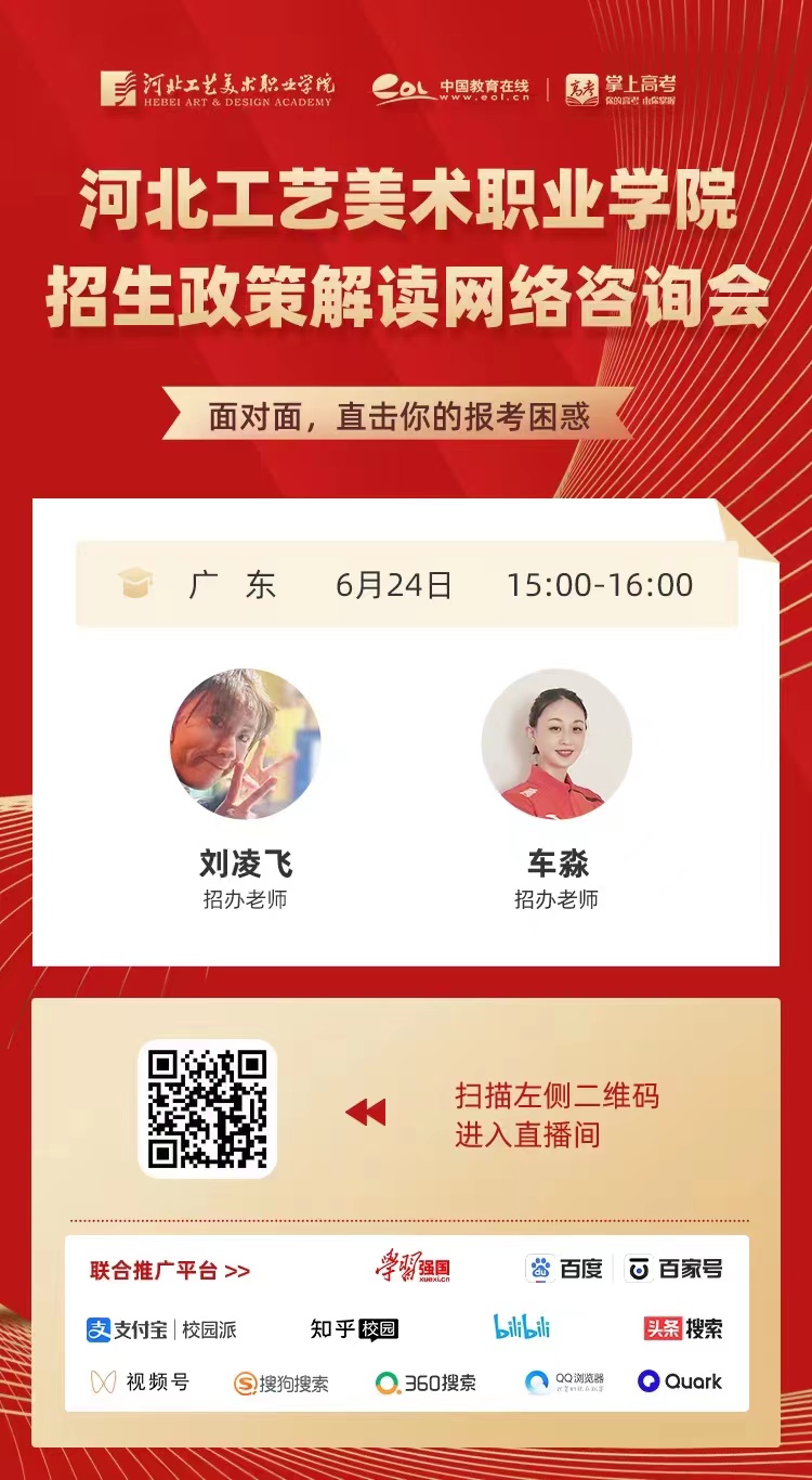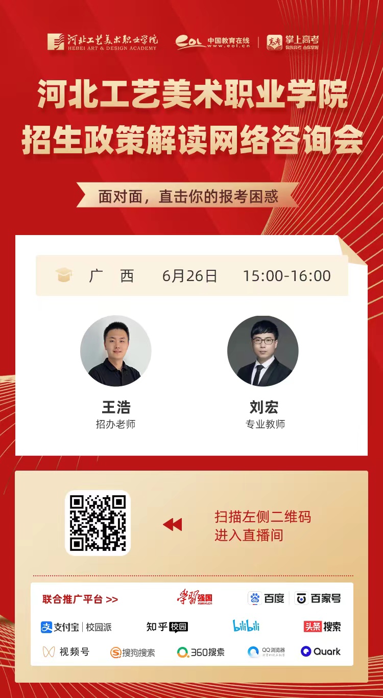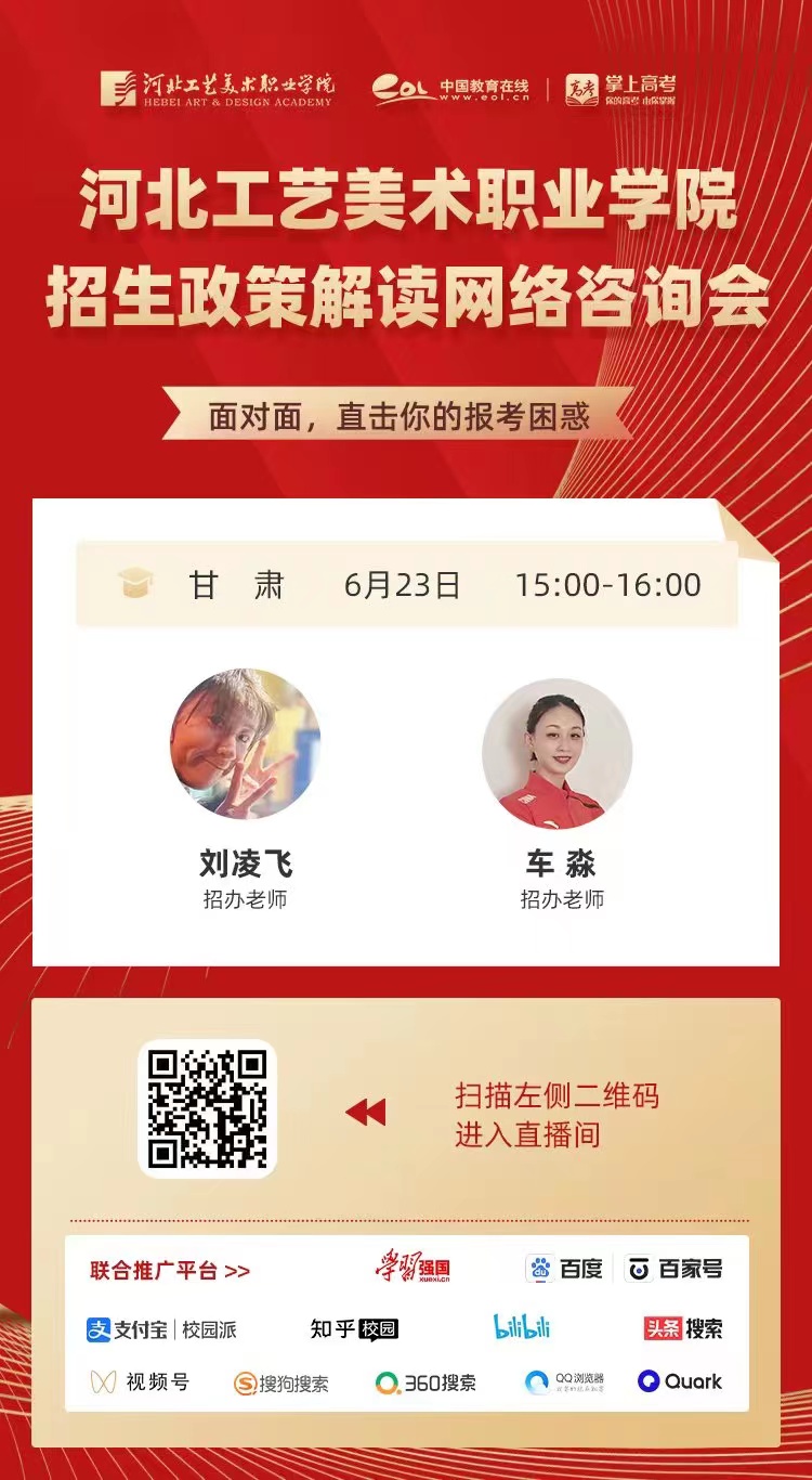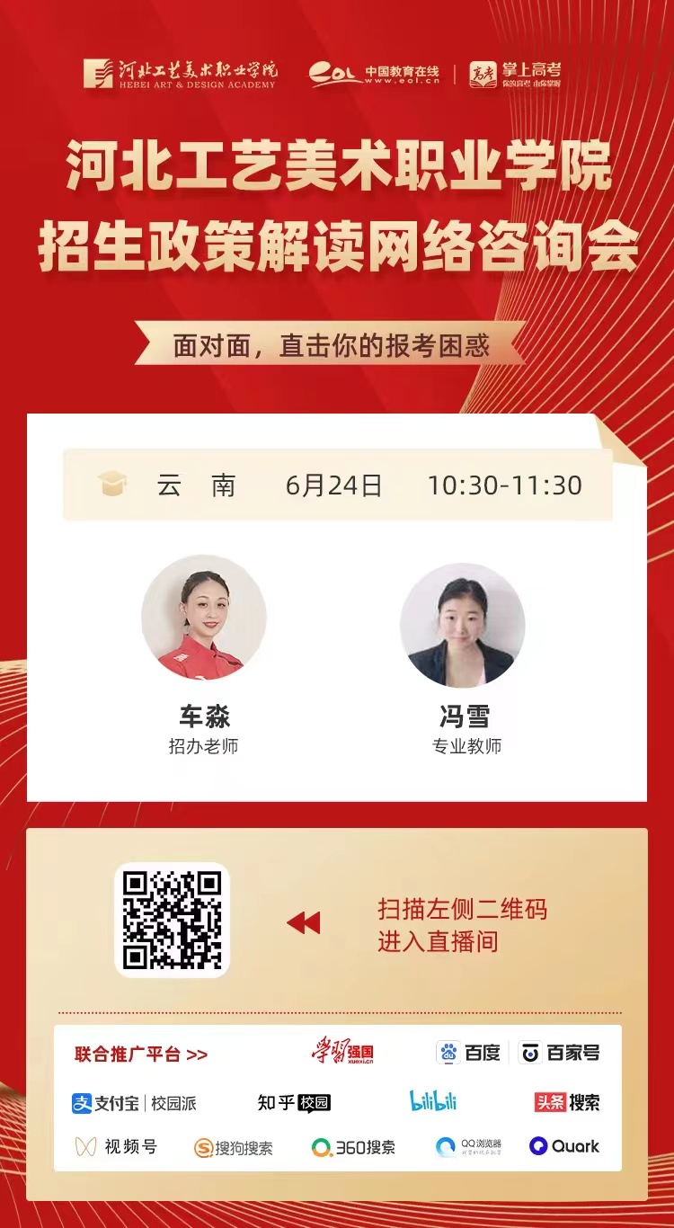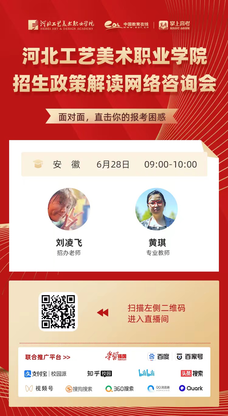 为满足广大考生和家长高考咨询需求,搭建考生、家长与我院沟通桥梁,6月21日开始,我院在“中国教育在线”、“求学宝”、“贵州升学网“、“云南教育宣传“等直播平台开展“河北工艺美术职业学院招生宣传直播专场”,每场直播持续1个小时左右,累计观看量近12万余次。
