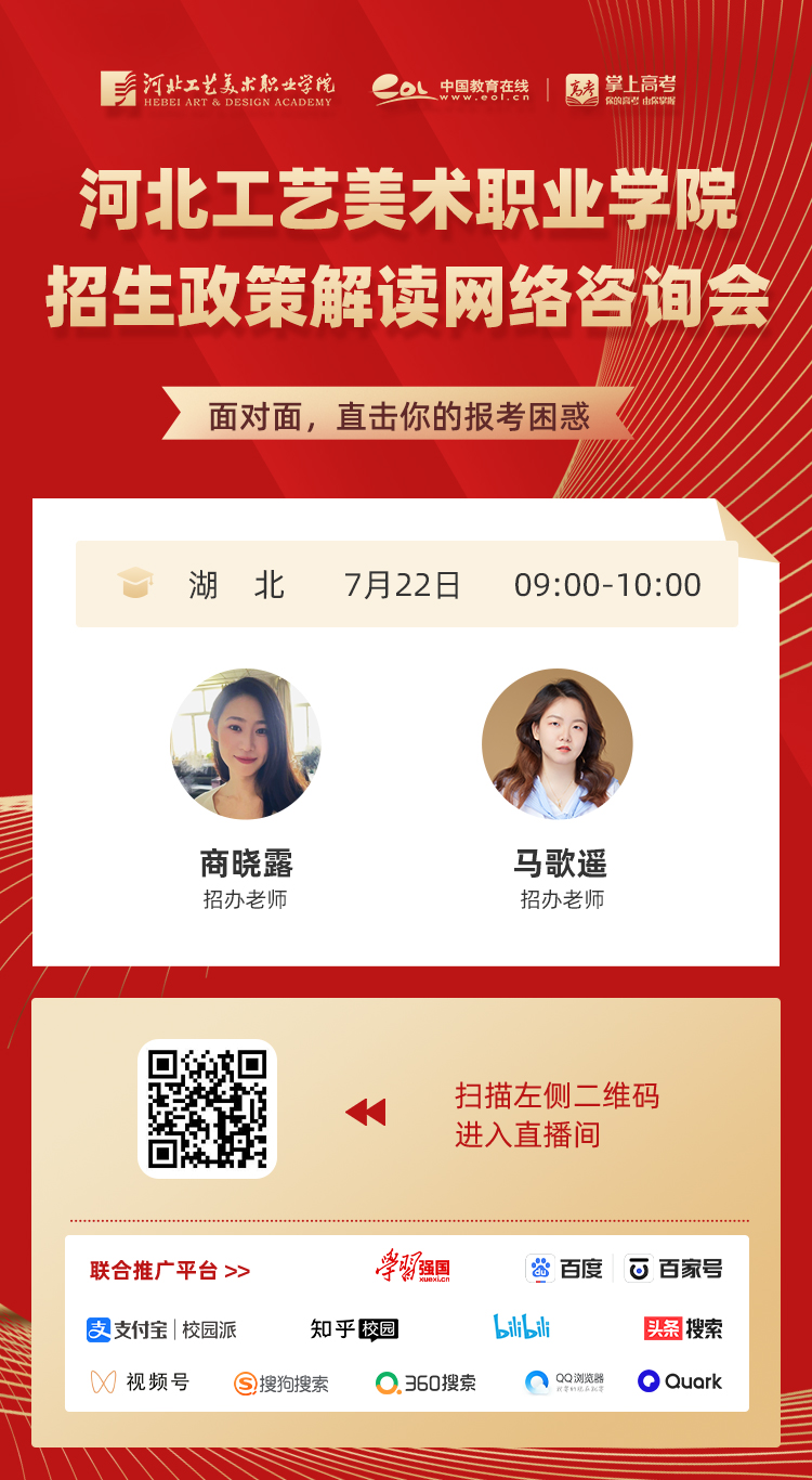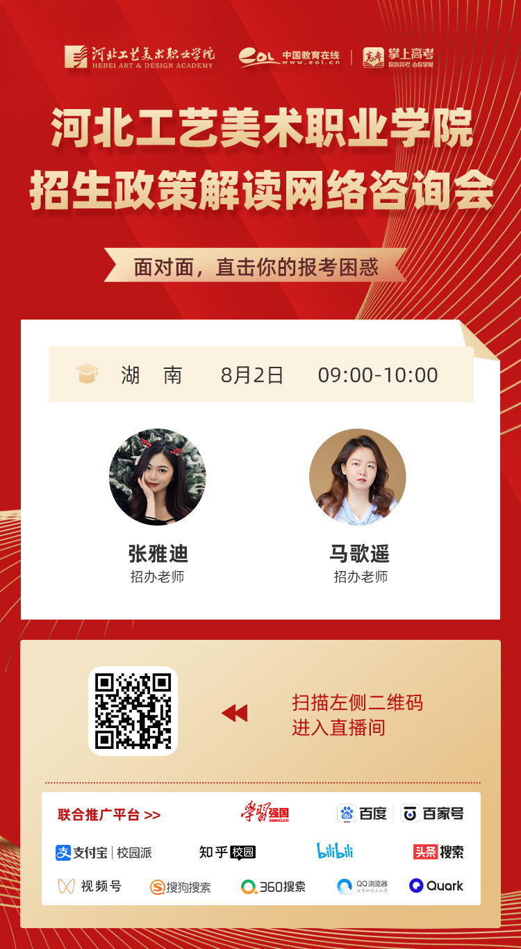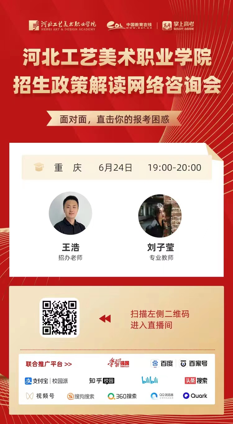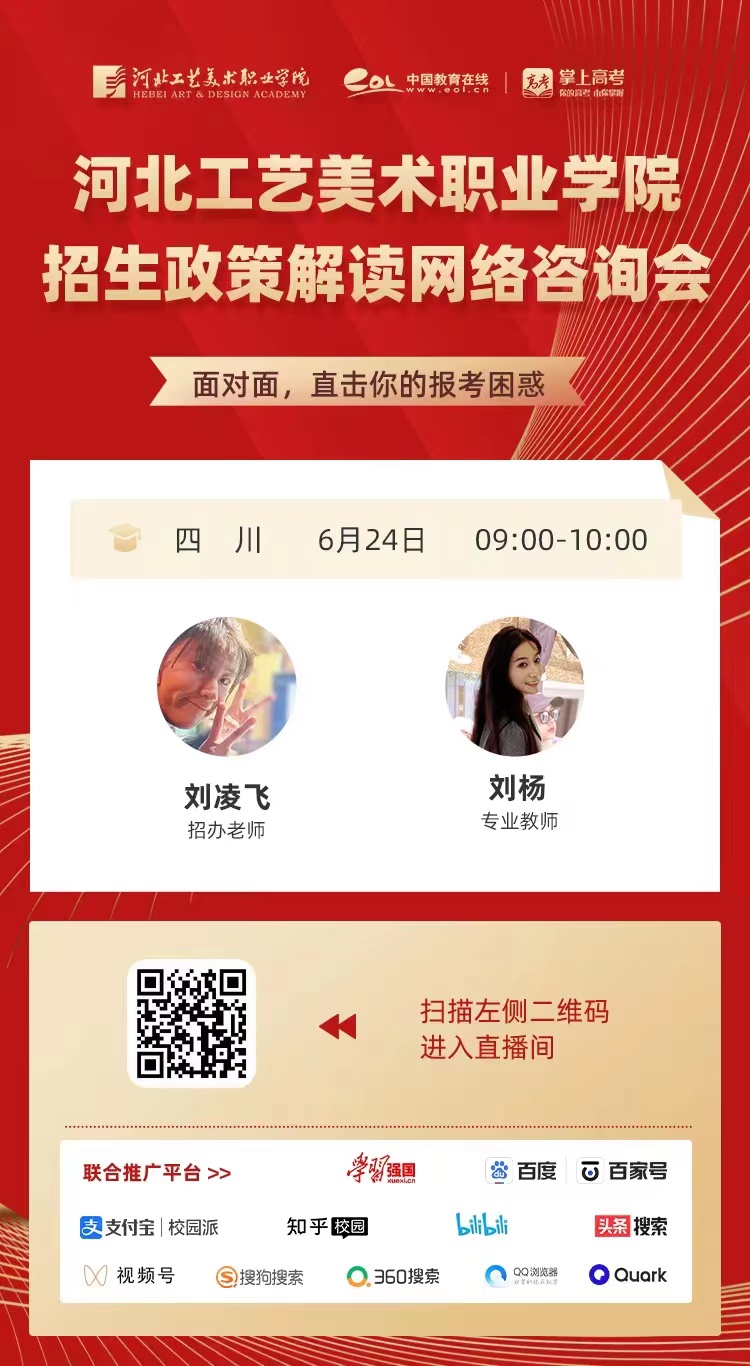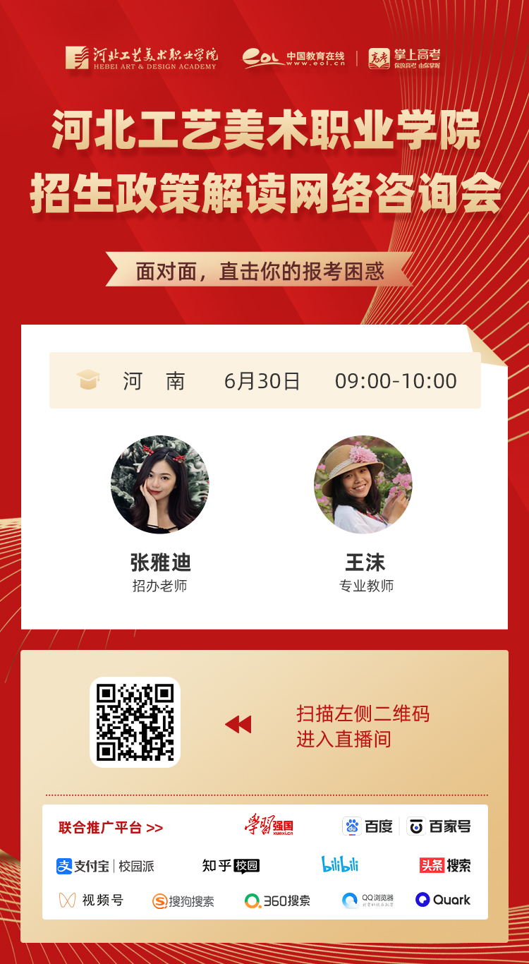 为满足广大考生和家长高考咨询需求,搭建考生、家长与我院沟通桥梁,6月21日开始,我院在“中国教育在线”、“求学宝”、“贵州升学网“、“云南教育宣传“等直播平台开展“河北工艺美术职业学院招生宣传直播专场”,每场直播持续1个小时左右,累计观看量近12万余次。