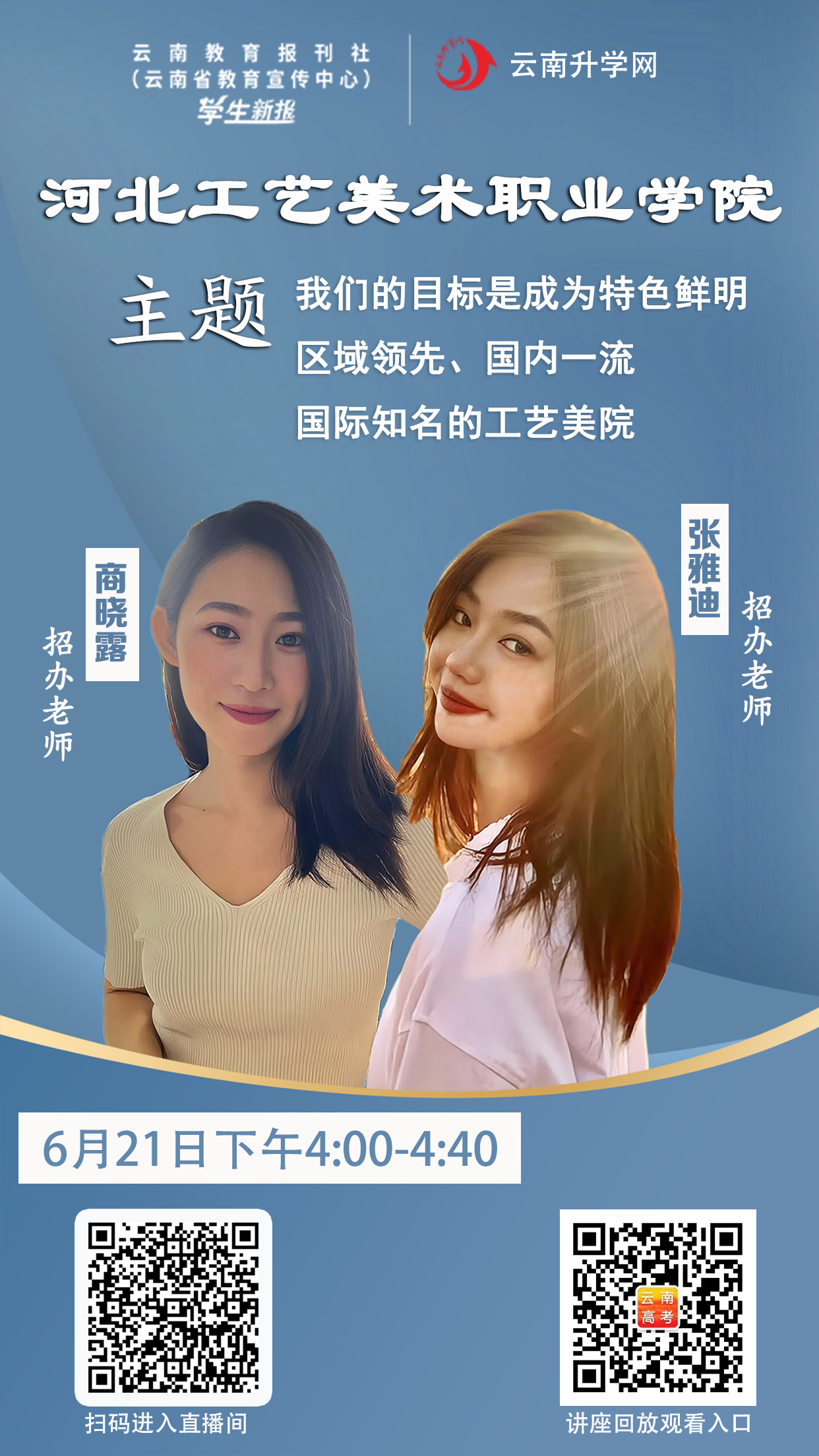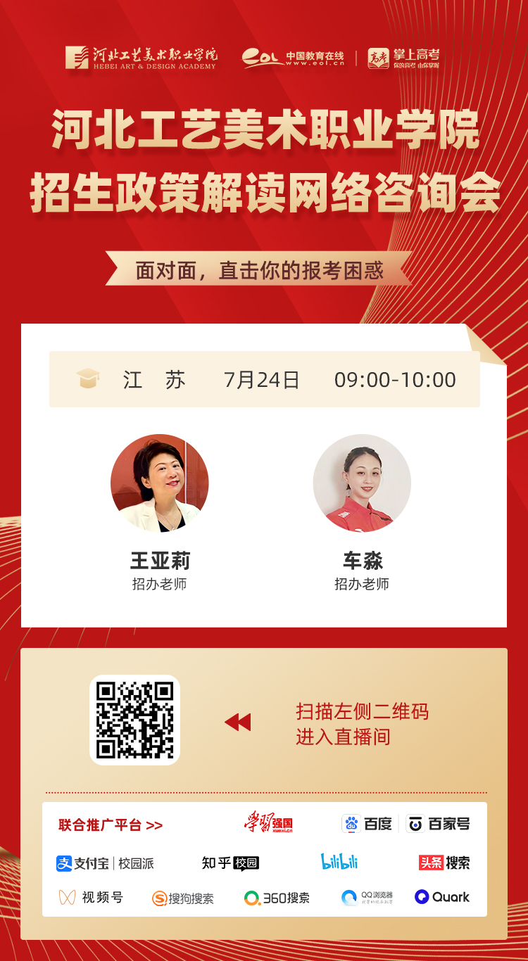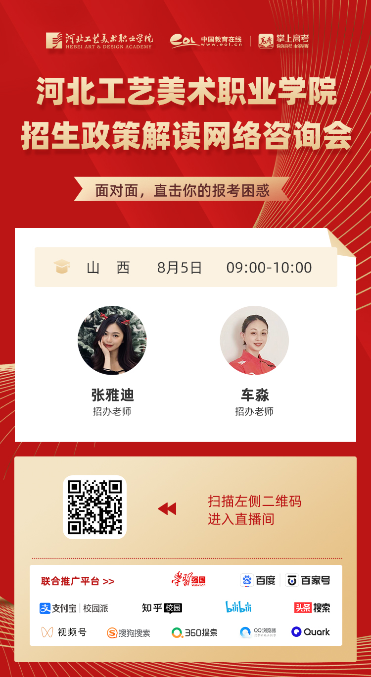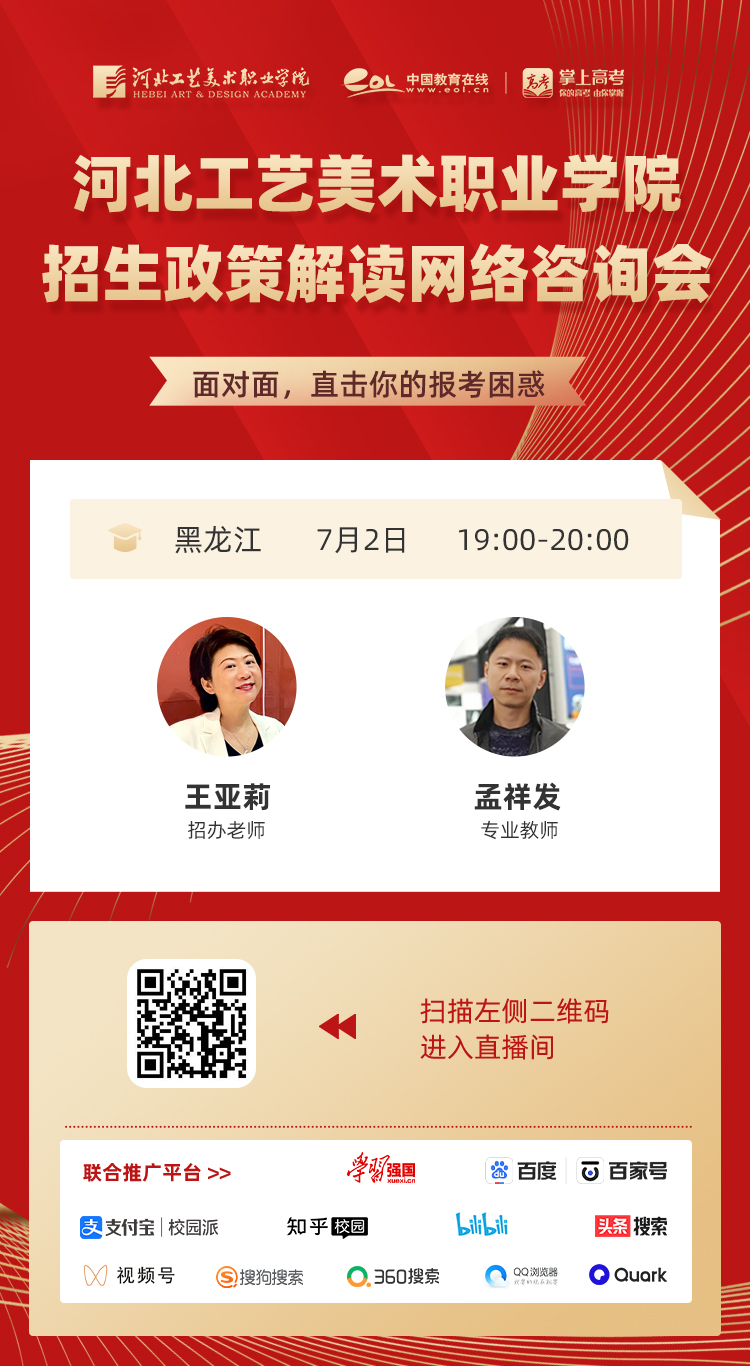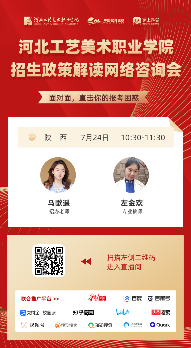 为满足广大考生和家长高考咨询需求,搭建考生、家长与我院沟通桥梁,6月21日开始,我院在“中国教育在线”、“求学宝”、“贵州升学网“、“云南教育宣传“等直播平台开展“河北工艺美术职业学院招生宣传直播专场”,每场直播持续1个小时左右,累计观看量近12万余次。