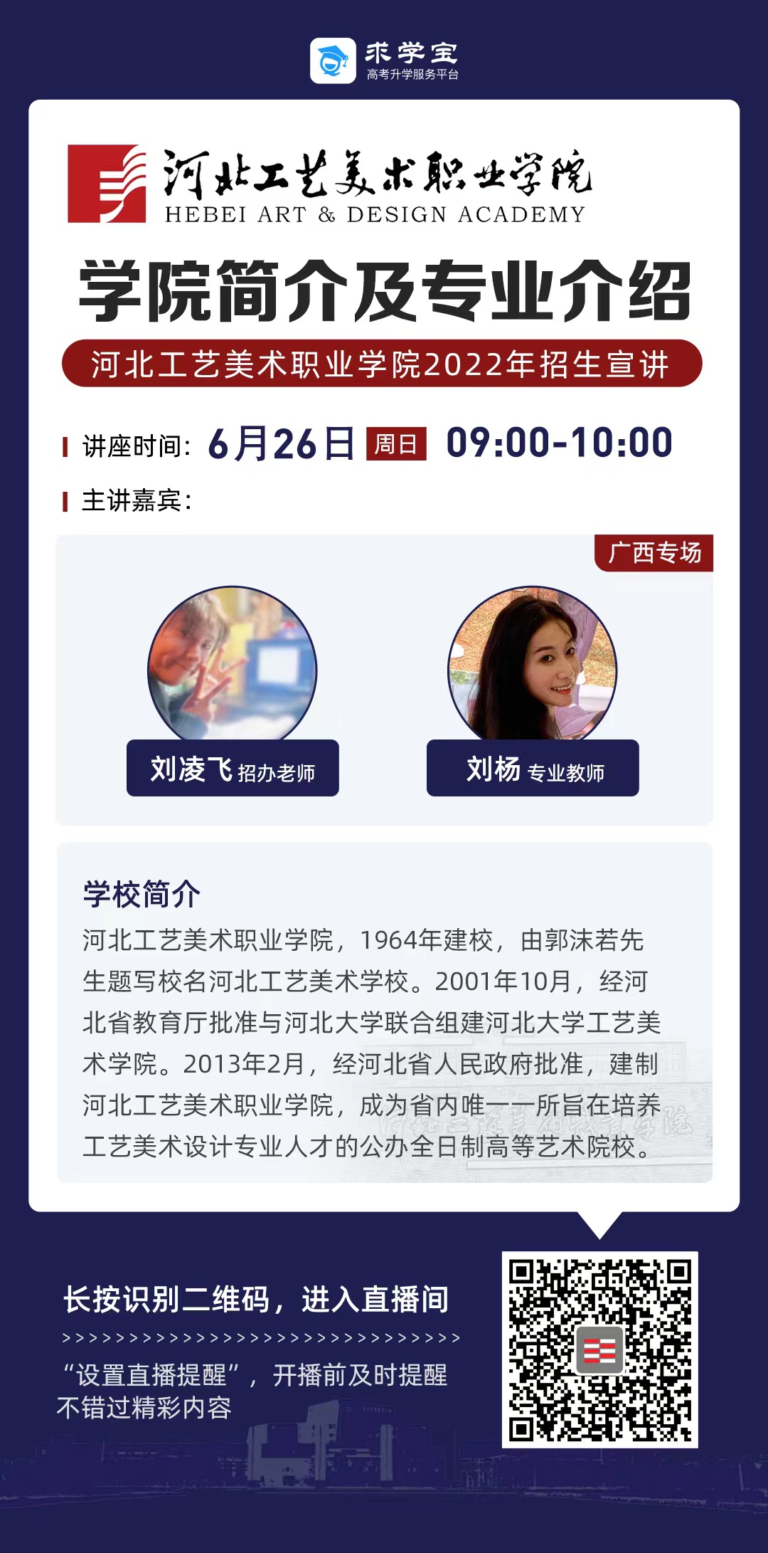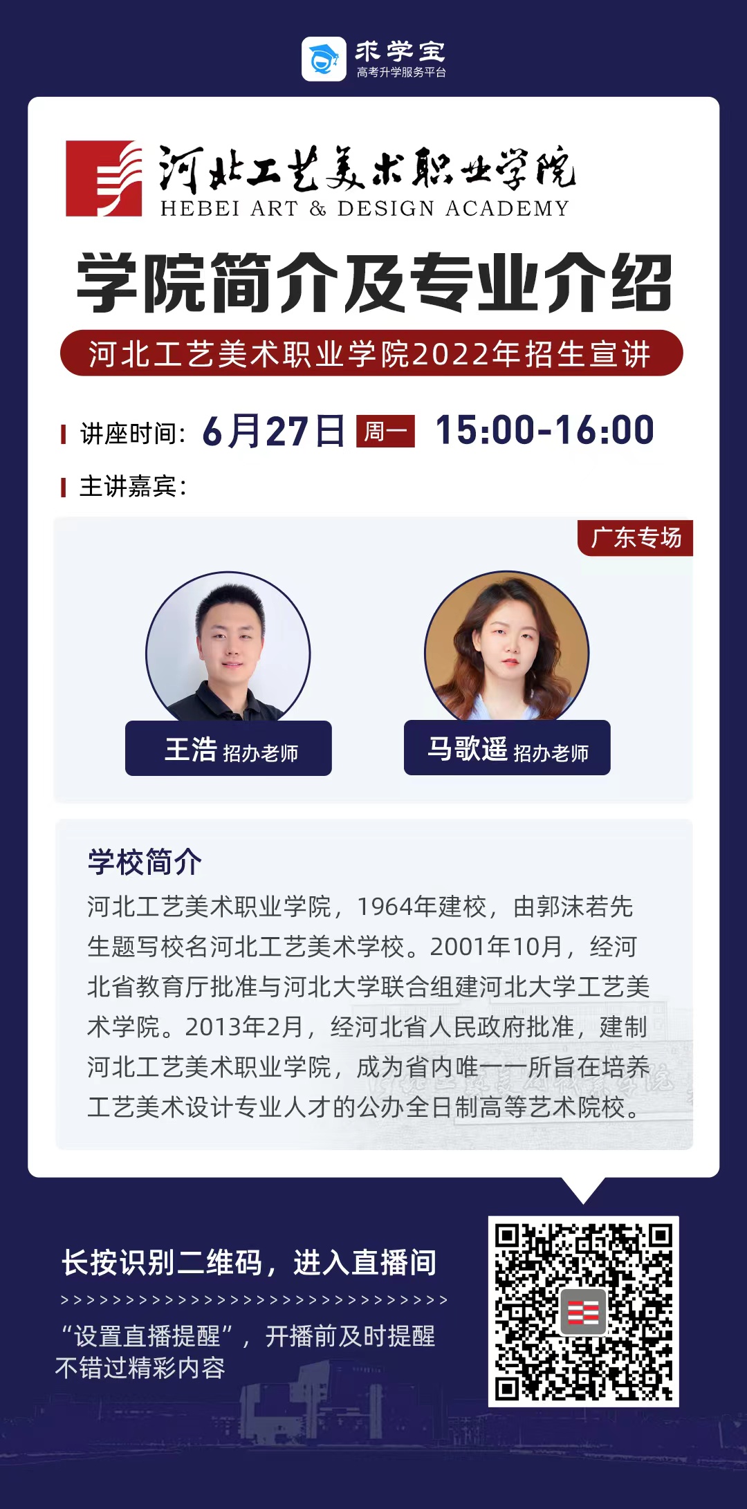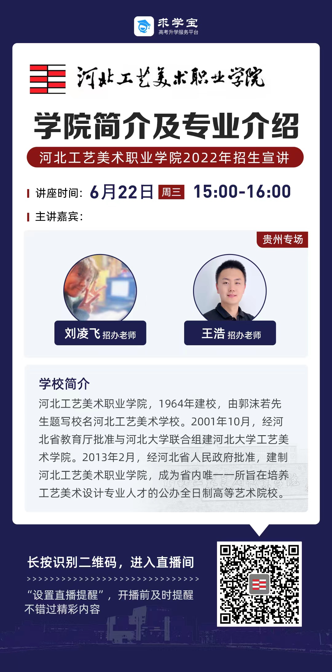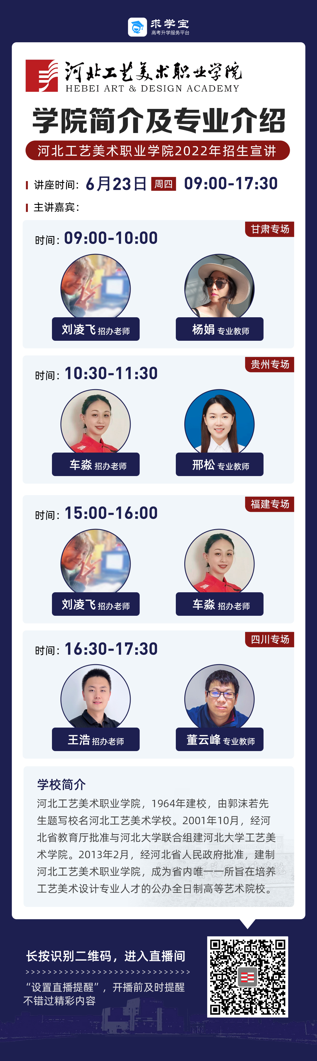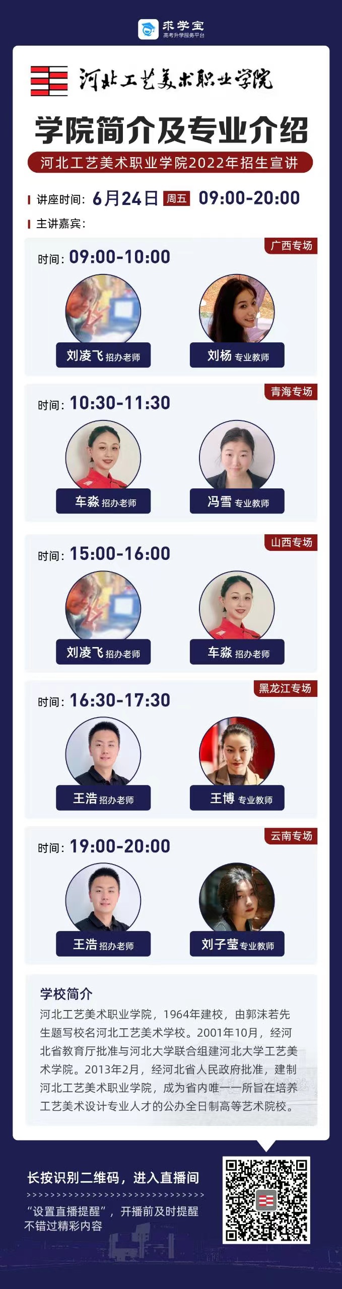 为满足广大考生和家长高考咨询需求,搭建考生、家长与我院沟通桥梁,6月21日开始,我院在“中国教育在线”、“求学宝”、“贵州升学网“、“云南教育宣传“等直播平台开展“河北工艺美术职业学院招生宣传直播专场”,每场直播持续1个小时左右,累计观看量近12万余次。
