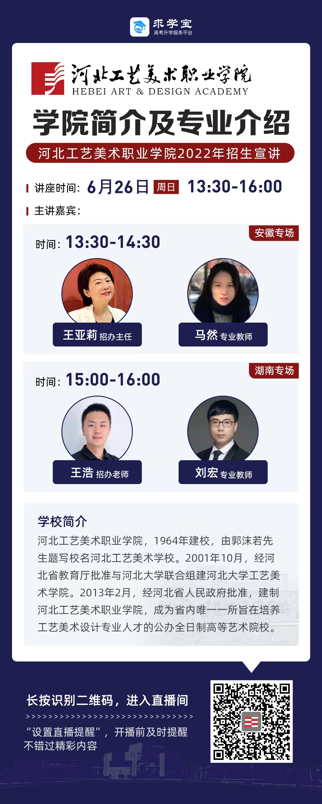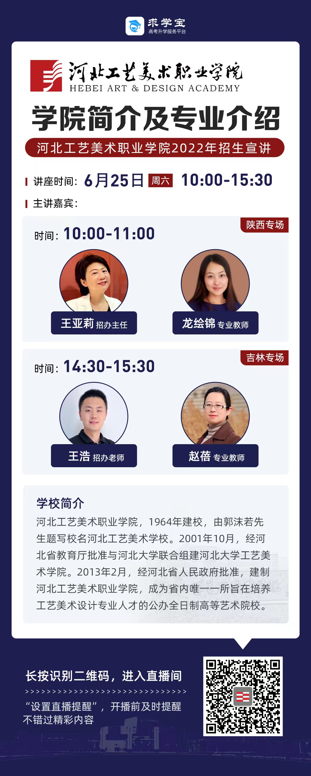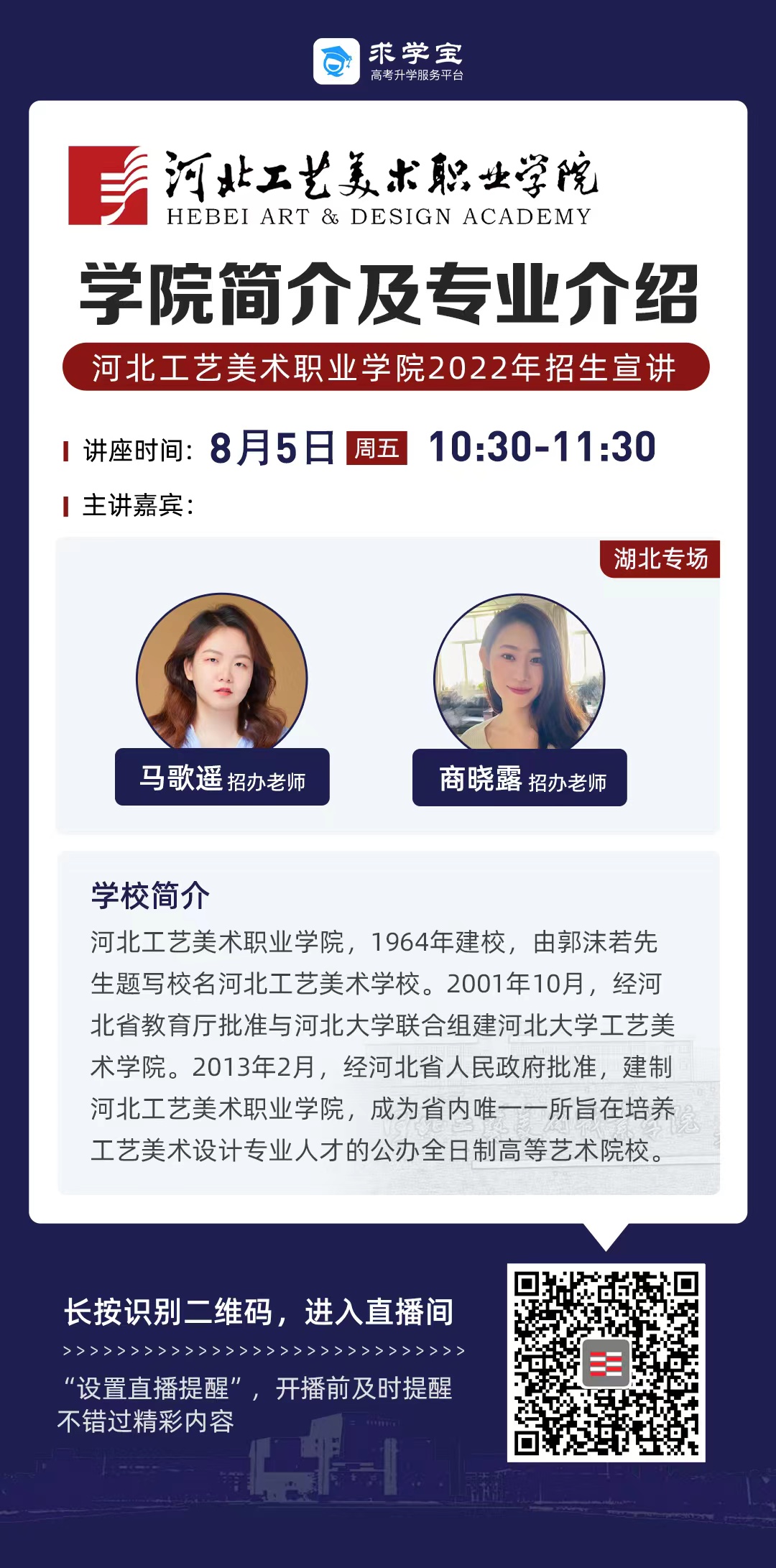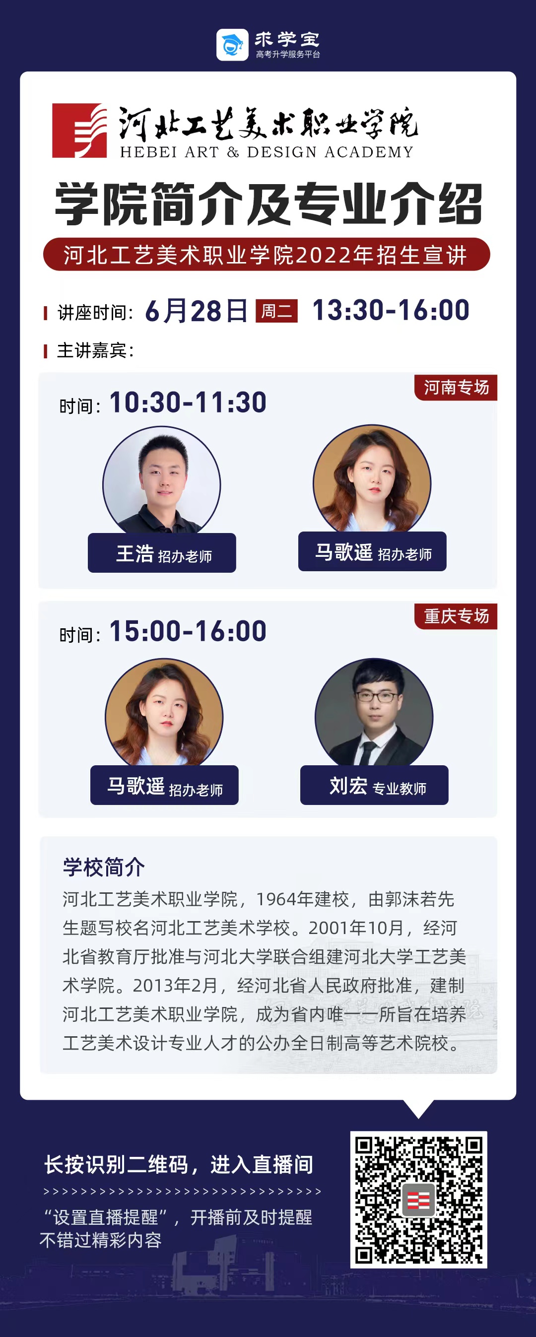 为满足广大考生和家长高考咨询需求,搭建考生、家长与我院沟通桥梁,6月21日开始,我院在“中国教育在线”、“求学宝”、“贵州升学网“、“云南教育宣传“等直播平台开展“河北工艺美术职业学院招生宣传直播专场”,每场直播持续1个小时左右,累计观看量近12万余次。