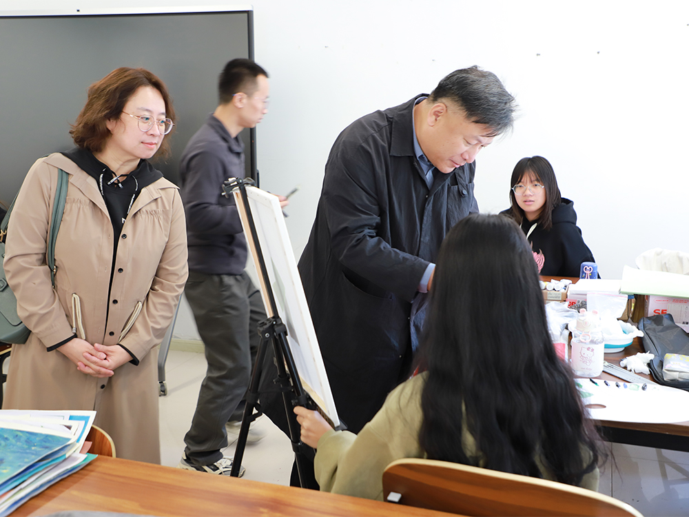 赵云耕一行深入到教室、展览馆,了解师生上课情况,参观视觉传达系、美术系结课作品展。艺术实践中心教学秩序井然,师生们展现出了饱满的工作与学习状态。