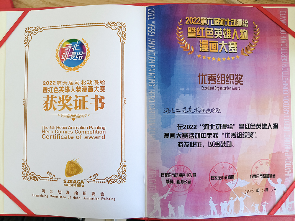 本次“河北动漫绘”暨英雄人物漫画大赛中,我院荣获优秀组织奖。王博、霍燃、黄琪、刘子莹、王晓桐五位老师被评为大赛优秀指导教师。