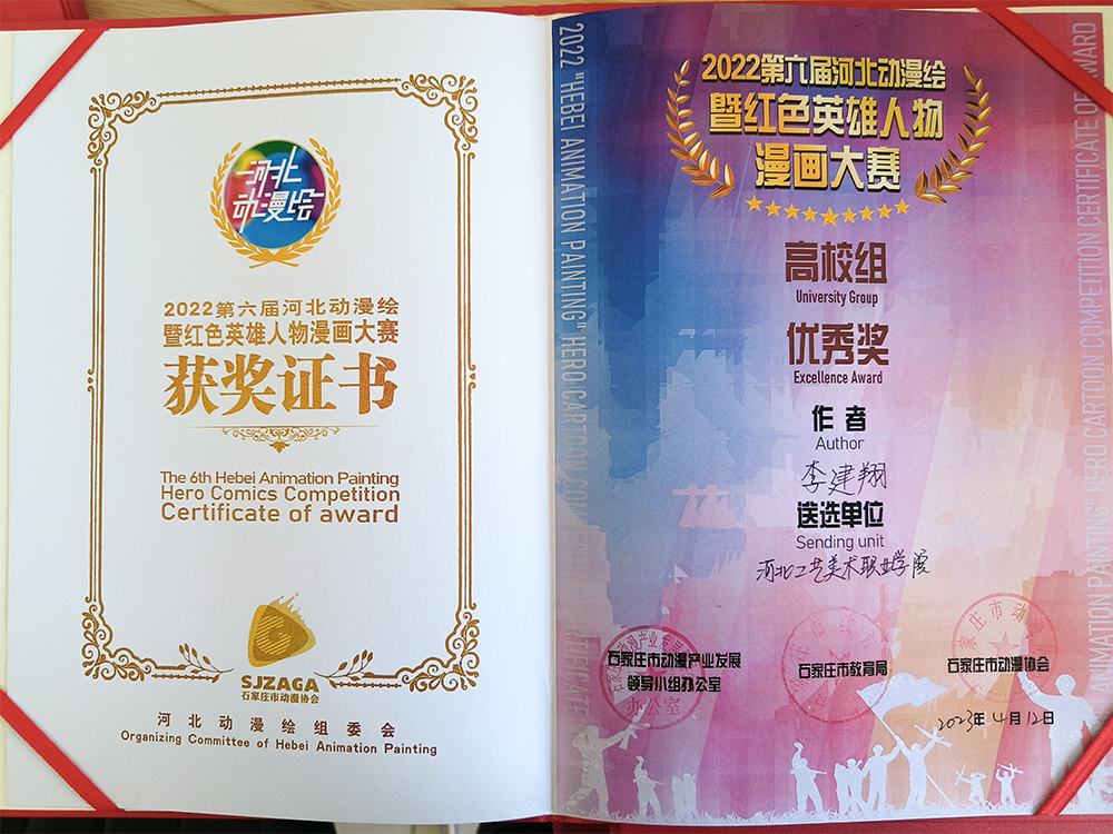 数字艺术设计系在进行“插画与漫画”这一教学任务中,组织学生参加2022“河北动漫绘”暨红色英雄人物漫画大赛。赛事以河北红色英雄人物原型为蓝本进行漫画创作。弘扬红色英雄的伟大事迹和光辉形象,引导学生回望历史,感悟爱国青年为国奉献的高尚情怀,在提升专业技术水平能力过程中加强学生自身思想道德建设。
