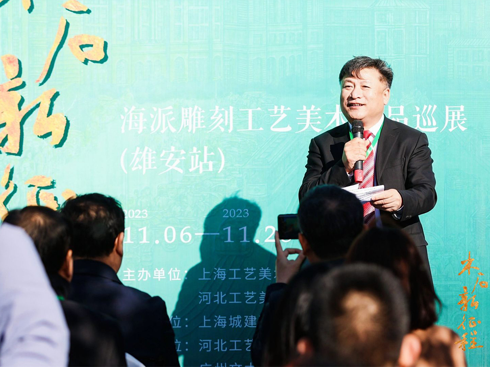 11月6日,由我院与上海工艺美术职业学院共同主办的“木石新征程--海派雕刻工艺美术作品巡展”在雄安新区长信美术馆开幕。上海城建职业学院副校长仓平、上海工艺美术职业学院科研处处长陈悦、上海城建职业学院建筑与环境艺术学院院长高守雷、上海城建职业学院建筑与环境艺术学院党总支书记邵东东、雄安新区容东管委会副主任谭振勇、容西管委会一级业务办主任王向忠等嘉宾出席开幕式。