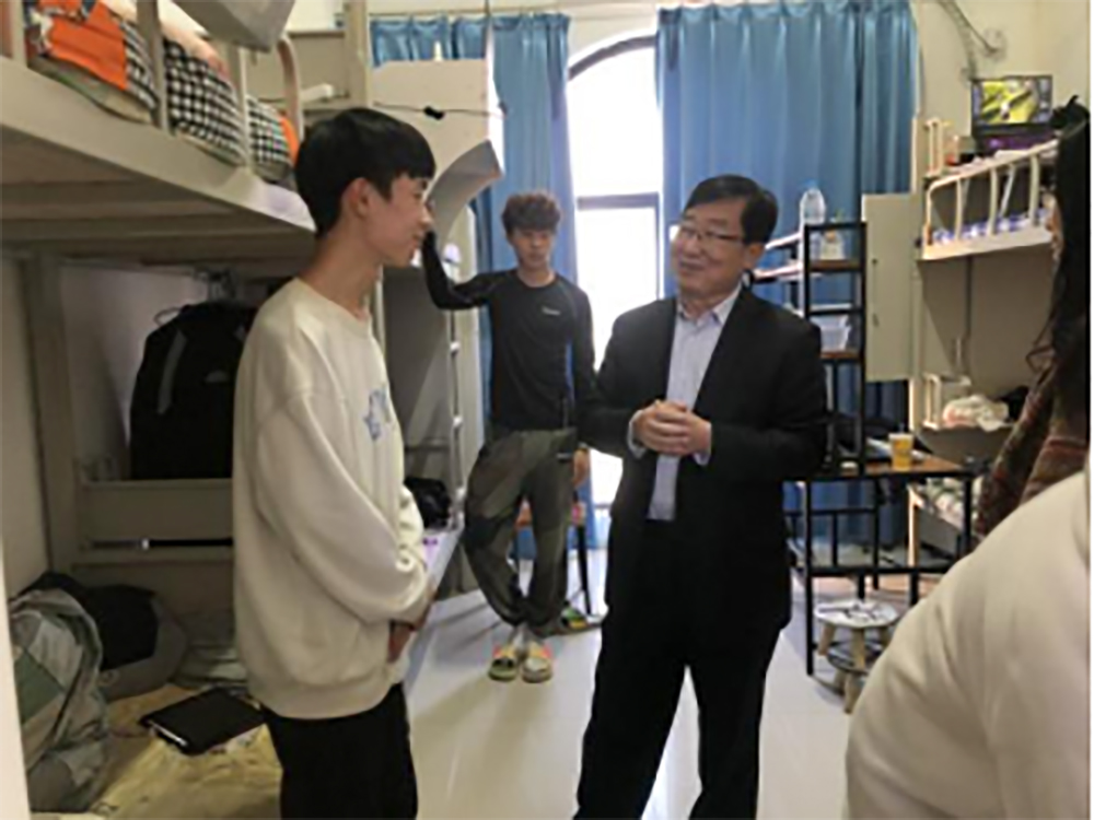杨庆华来到教室查看了线路、插座改造项目,并深入到学生宿舍详细查看了水电、生活设施的安全情况,并与学生亲切交谈,了解学生学习、生活等方面的情况。