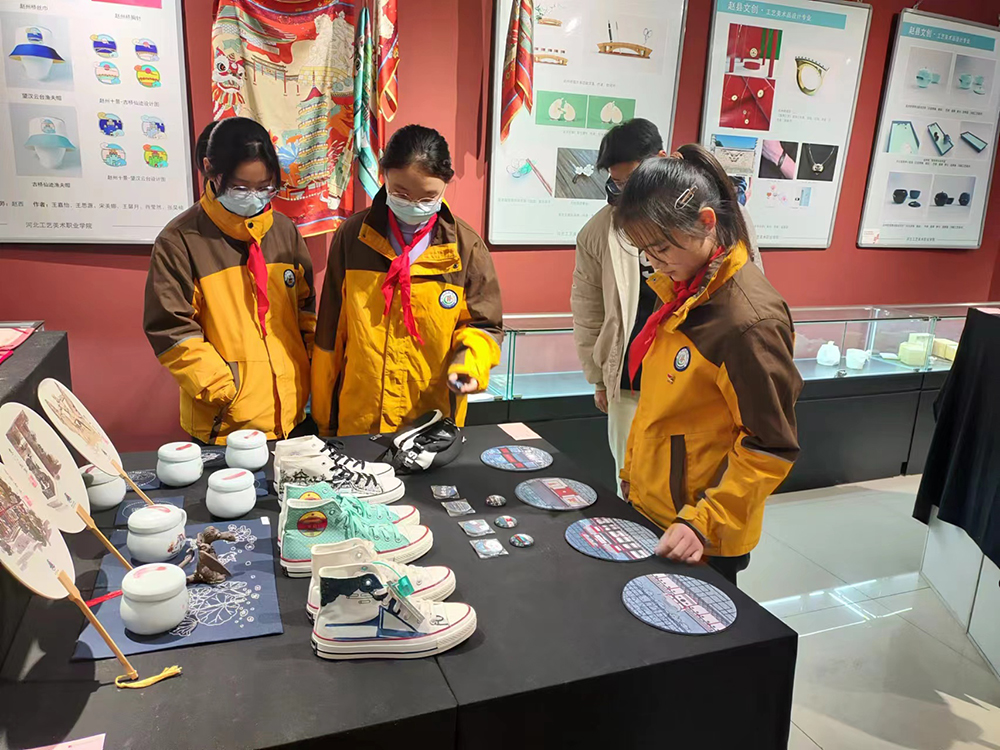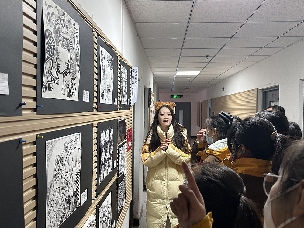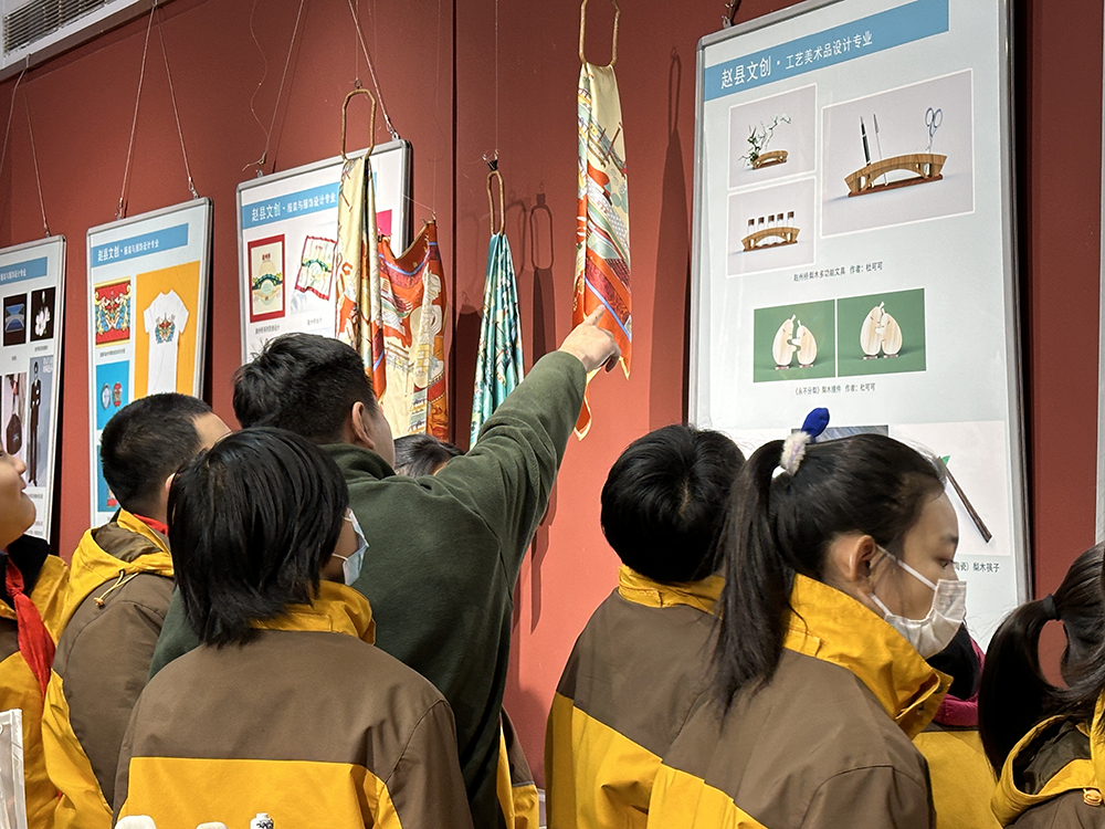 活动伊始,少先队员们在首饰设计与工艺专业教师邱明月的带领下参观时尚工艺系主办的“互为他山”主题展览。少先队员们观看了雄安非遗文创、武强年画文创、保定文旅元素文创、赵州礼物、首饰设计作品、工艺美术品设计作品、服装与服饰设计作品。邱明月通过讲解作品的创作理念,为少先队员们展示出作品独特的美学和艺术价值。