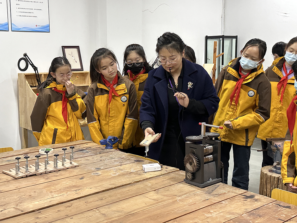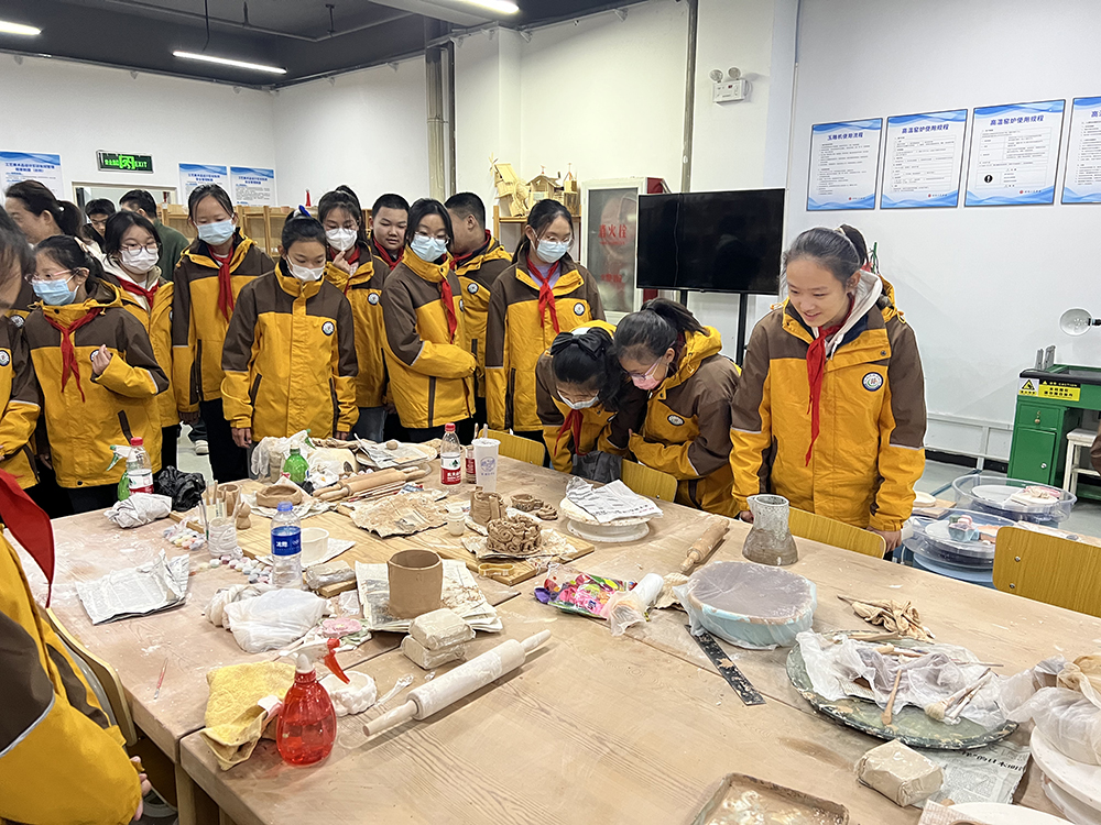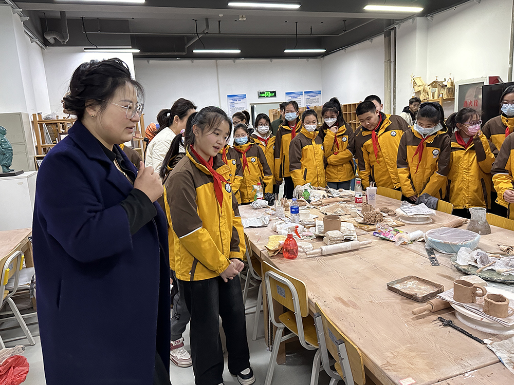 随后,邱明月带领少先队员们来到了工艺、首饰工坊,工艺美术品设计教研室主任姜珊用通俗易懂的语言详细讲解制作陶艺的重要机器和制作过程。小朋友们聚精会神、认真思考、积极互动,现场气氛十分活跃。