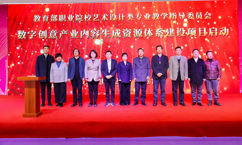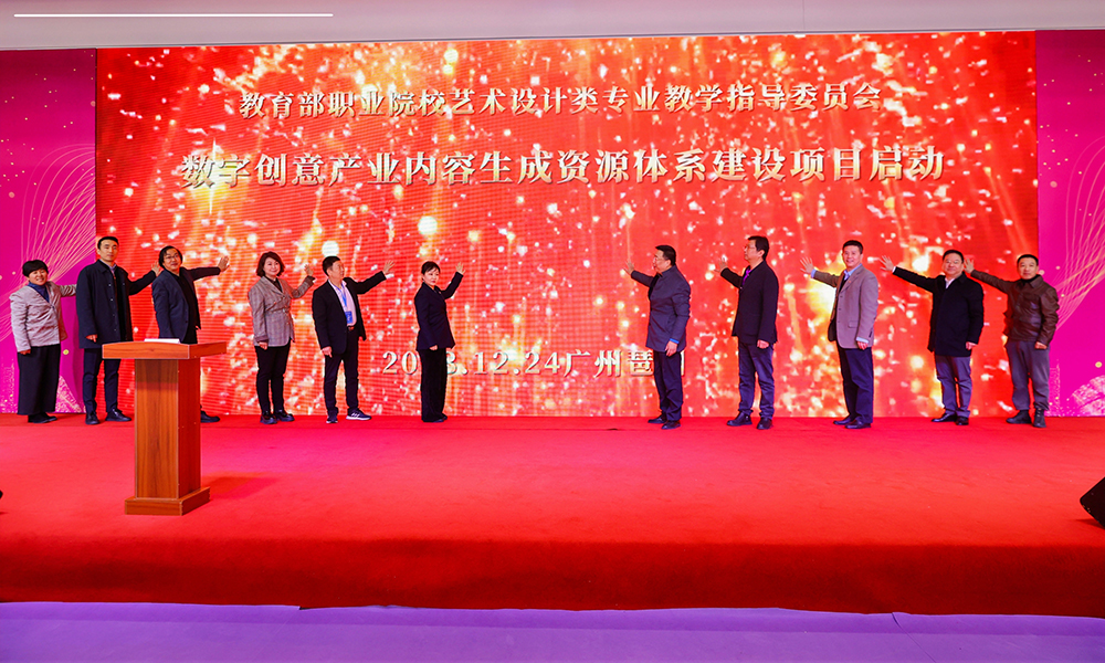 12月24日,在全国职业院校艺术设计类优秀作品展暨 2023年校企融合成果转化对接会的活动现场,张广军院长作为嘉宾与教育部领导,教学指导委员会主任委员、副主任委员、秘书长,各校校长等一起上台参与了“数字创意产业内容生成资源体系建设项目”的启动。