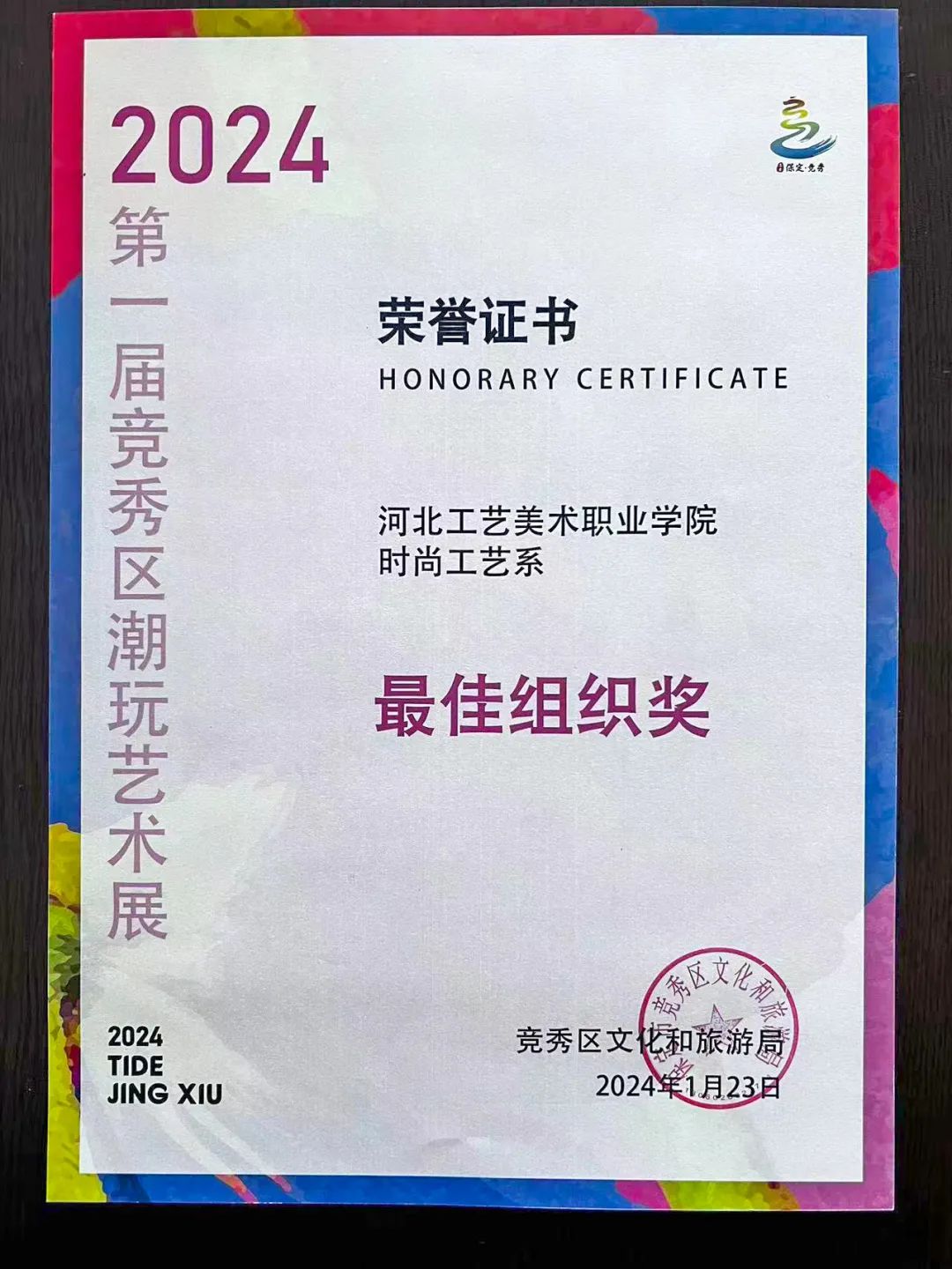 我校时尚工艺系、数字艺术设计系、视觉传达设计系、招生就业处数十名师生参与了作品创作及现场活动。其中时尚工艺系师生在活动策划、前期筹备、方案产出、志愿服务等方面做了大量工作,荣获文旅局颁发的“最佳组织奖”。此外,我校12组作品荣获“优秀作品“,12名同学获志愿者证书。