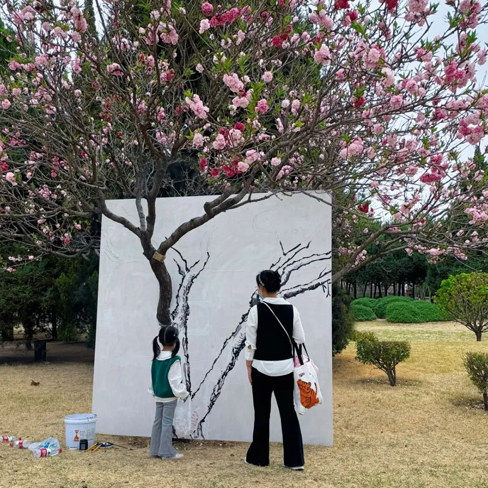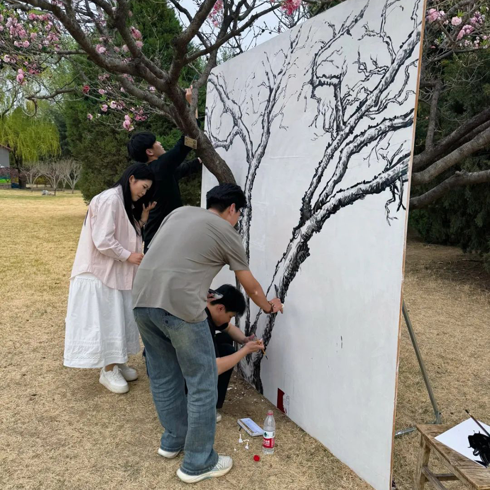 活动中,志愿者们专注地在一块巨大的画布上作画,将真实的碧桃树融入画作,使之成为一幅立体的艺术作品。从远处看,树干与画布仿佛合二为一,以景融画,以画衬景。
