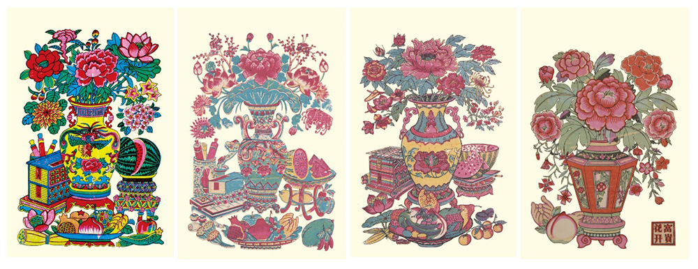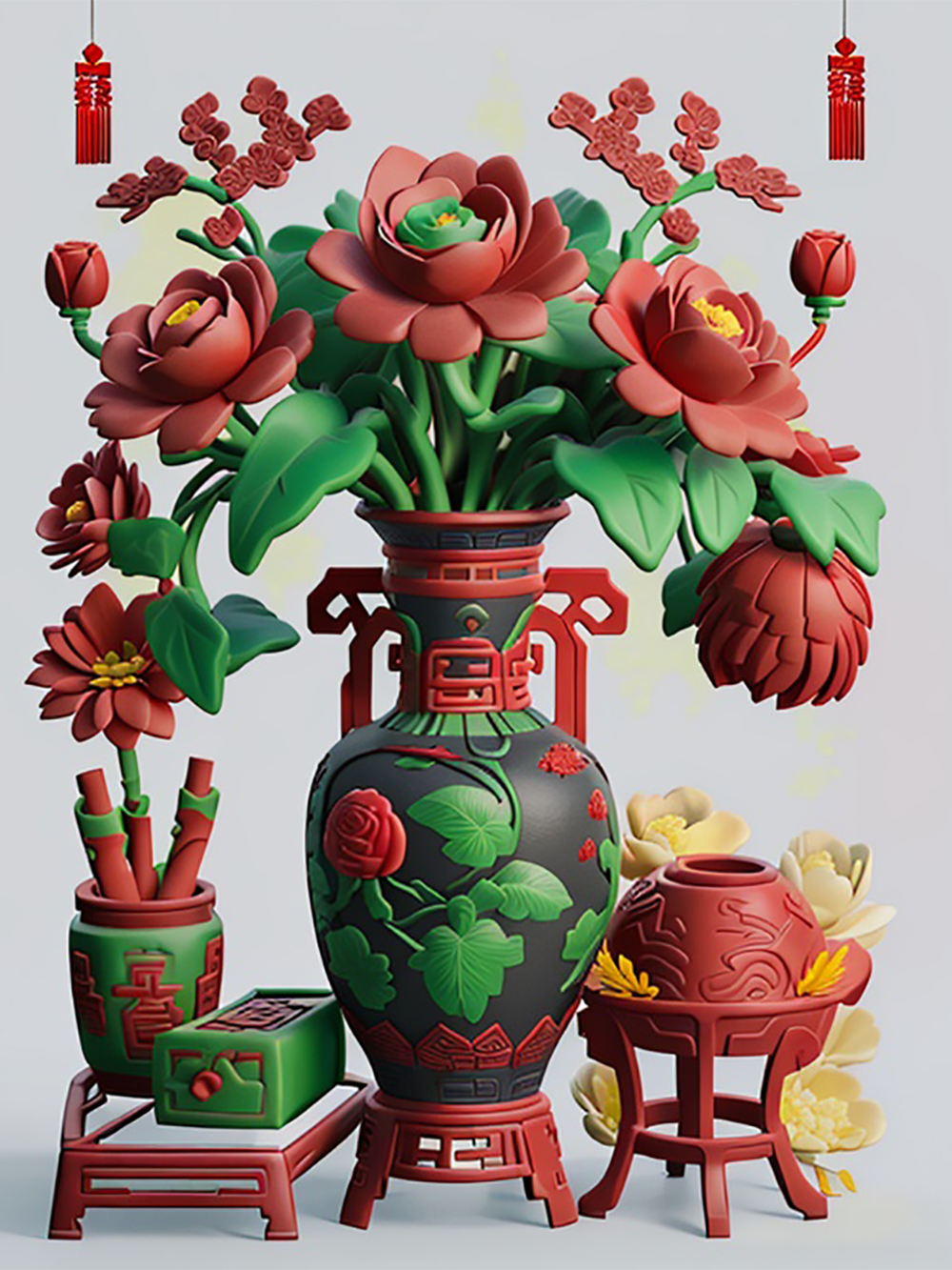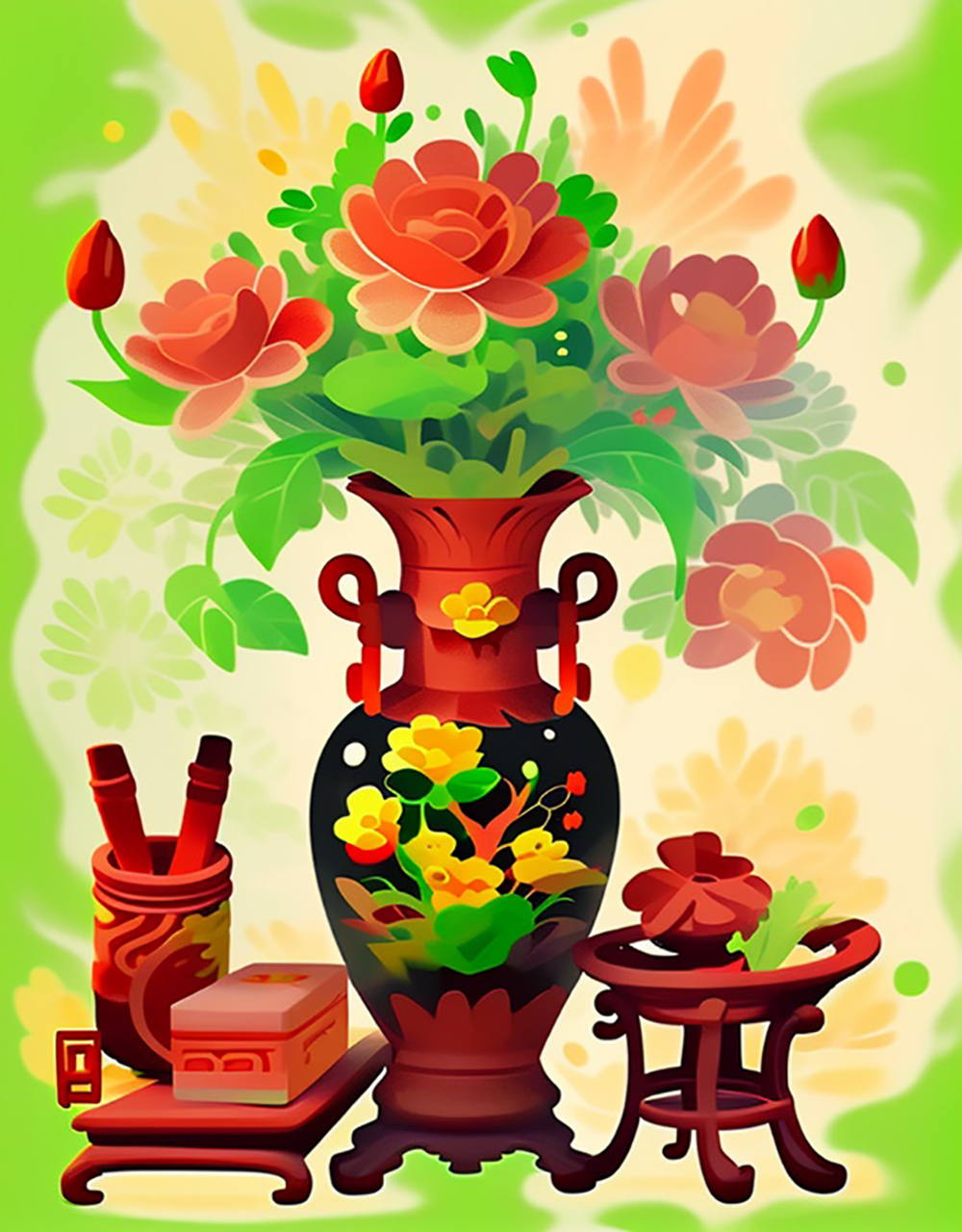狮子老虎大花瓶,走遍天下不受穷”。武强年画是河北地区传统年画的代表,俗语里“大花瓶”指的便是年画“花开富贵”,花瓶代表平安,牡丹花象征富贵,瓶中所插的牡丹花、荷花、菊花和梅花象征一年四季,表示一年四季平安富贵。果盘中的寿桃、佛手、广柑、葡萄和切开的西瓜,表示多子、多福、多寿。“花开富贵”以其鲜艳的色彩和吉祥的寓意,深受人们的喜爱。随着人工智能技术的广泛应用,我校AIGC数智团队将古老艺术和现代AI结合,创新出一系列武强年画“花开富贵”AI作品,让国家非物质文化遗产焕发新生。