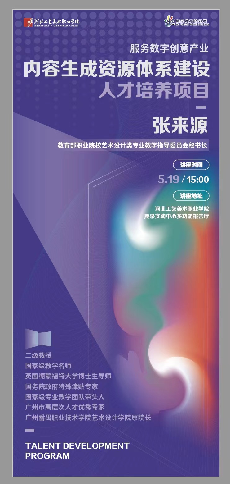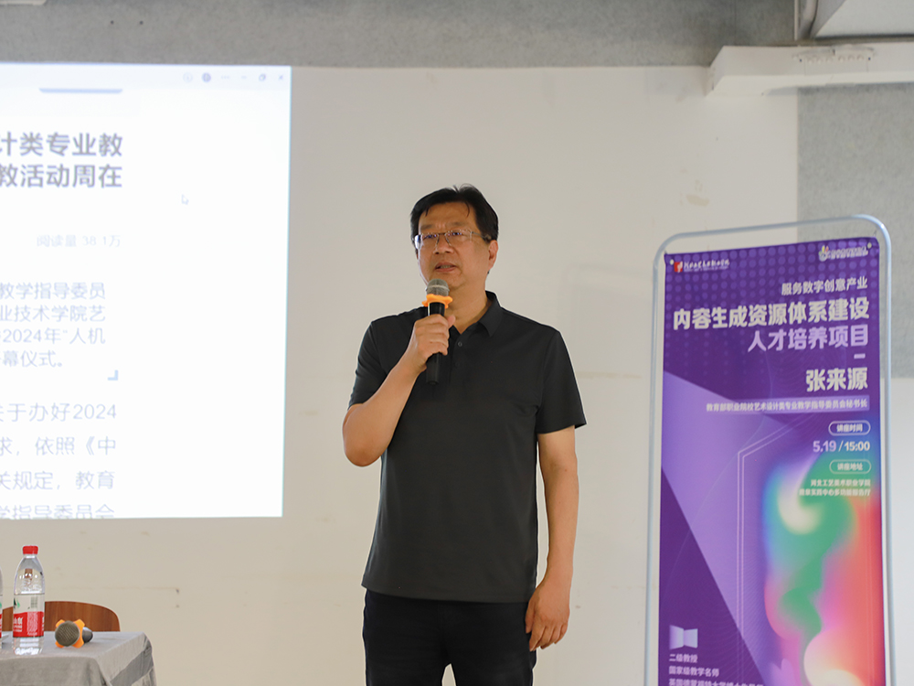 为全面贯彻落实党的二十大精神,在教育强国建设中开创职业教育新局面、塑造新赛道,大力培养高素质技能人才,助力发展新质生产力,支撑中国式现代化。学校积极响应教育部等十部门组织全国各地开展的“ 一技在手,一生无忧”职业教育活动周、教育部职业院校艺术设计类专业教学指导委员会开展的“人机共创”中国技艺职业教育活动周活动,按照相关要求,5月19日下午,我校邀请教育部职业院校艺术设计类专业教学指导委员会秘书长、国家级教学名师、英国德蒙福特大学博士生导师、国务院政府特殊津贴专家、国家级专业教学团队带头人、广州市高层次人才优秀专家、广州番禺职业技术学院艺术设计学院原院长张来源教授作专题讲座。校长张广军、相关职能部门负责人等500余名师生、企业代表聆听讲座。张广军主持讲座。