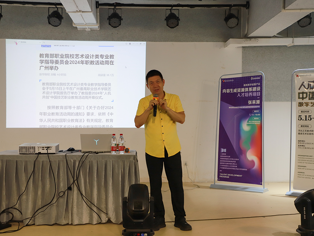 张来源以“服务数字创意产业、内容生成资源体系建设、人才培养项目”为题,首先介绍了本次职教周的基本情况,向师生讲解了“人机共创”中国技艺职业教育活动周的具体内涵,鼓励我校师生积极参与相关活动。其次从聚焦数字创意产业出发,围绕解决AI、VR、AR等数字技术在人居环境、工艺美术等应用领域数字内容生成的原创、制作、交互等关键问题,提出应补齐数字创意内容的生成短板,形成数字资源体系,服务生产性企业智能化升级。最后以《庄子·外篇•知北游》中的“天地有大美而不言”作为终篇,向广大师生强调美育重要性,提出学校应注重美育资源的建设,培养学生对美的热爱与追求,让美育理念贯穿学校教育的方方面面。