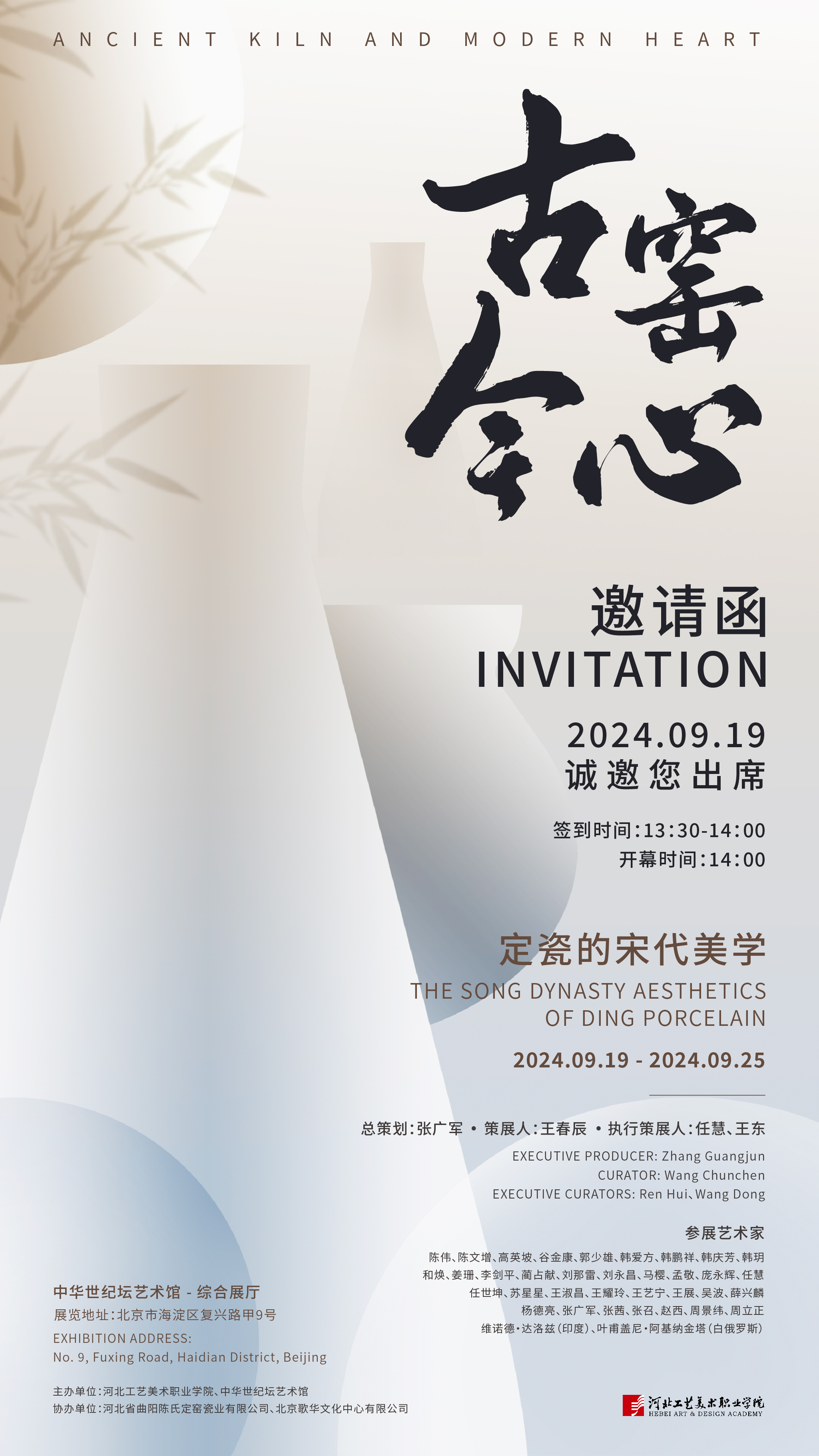 由我校与中华世纪坛艺术馆联合举办的“古窑今心——定瓷的宋代美学”展览,将于2024年9月19日至25日在中华世纪坛艺术馆举办。