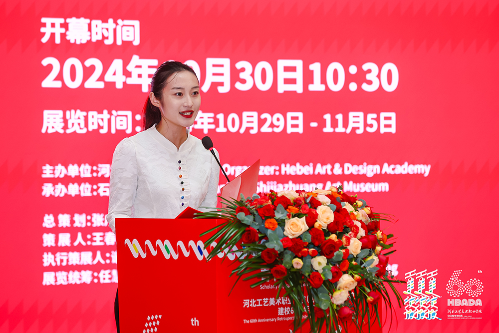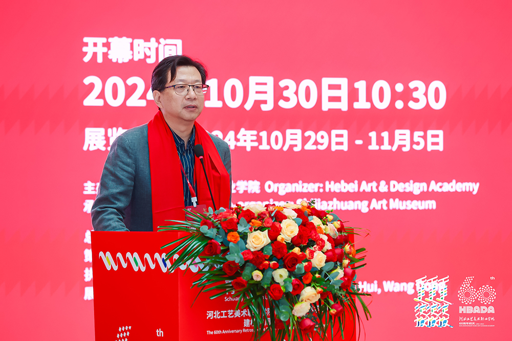 张广军致答谢辞。他指出,此次展览不仅是对学校六十年来辛勤耕耘与辉煌成果的回顾与致敬,更是对未来发展的展望与期许。六十年的光辉历程,既是河工美坚持与奉献的赞歌,又是河工美创新与发展的篇章,更是河工美人矢志不渝、追求卓越的生动写照。此次展览将激励更多师生继续在艺术与设计领域探索前行,为传承与发展工艺美术事业贡献自己的力量,同时也为文化创意产业发展注入新的活力与灵感,为河北工艺美术事业的研究、发展、创新、推广添砖加瓦。