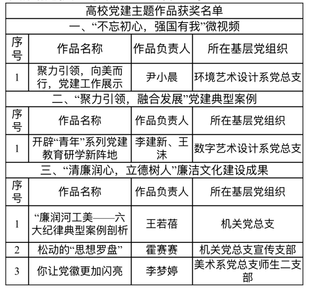 活动发布后,我校各基层党组织认真筹备、积极参赛,经过评审,共有5件优秀党建主题作品在本次评选活动中获奖。其中,环境艺术设计系党总支《聚力引领,向美而行,党建工作展示》获微视频类二等奖;数字艺术设计系党总支《开辟“青年”系列党建教育研学新阵地》获案例类三等奖;机关党总支《“廉润河工美——六大纪律典型案例剖析”学习宣传手册》、《松动的“思想罗盘”》及美术系党总支《你让党徽更加闪亮》获廉洁文化建设成果三等奖。
