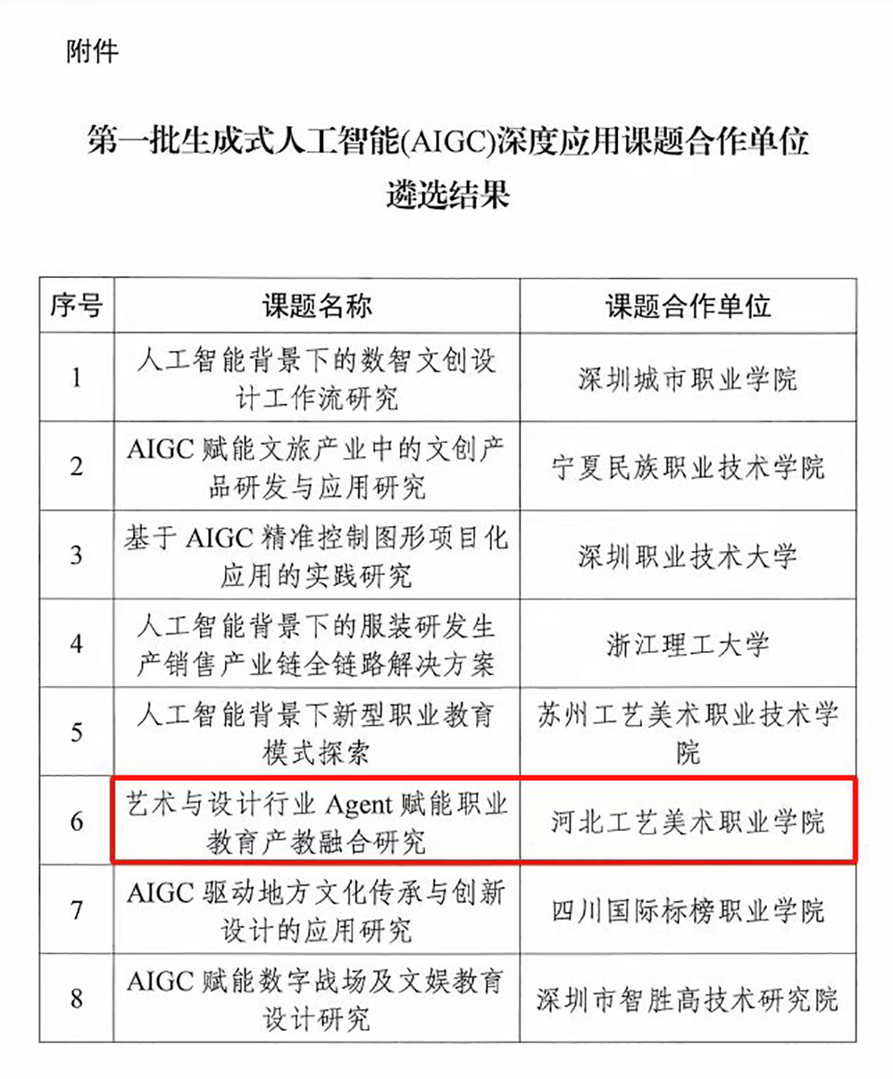 按照相关文件要求,经申报和评审工作,我校凭借《艺术与设计行业Agent赋能职业教育产教融合研究》课题成功入选第一批生成式人工智能深度应用课题的合作单位。该课题在我校校长、博士生导师张广军的主持下,由教务处牵头负责项目的承接与实施。