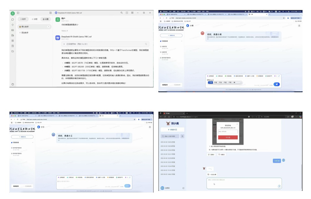 我校成功构建基于DeepSeek 70B模型的智慧教育教学生态体系:在DeepSeek模型的创新应用基础上,聚焦教育现代化领域,重点打造了“四维融合”的智慧教育生态体系,通过国产化大模型与职业教育的深度结合,构建了智慧校园服务矩阵。创新性地推出了“河小美”“学工-小工”“教务图书-小美”三款智能助手,分别服务于校园生活、学生管理和教学资源获取等场景。可为教师提供个性化教案设计、学生作业智能评价、学习进度分析等服务,这不仅提升了校园服务的智能化水平,还实现了全天候的服务覆盖。