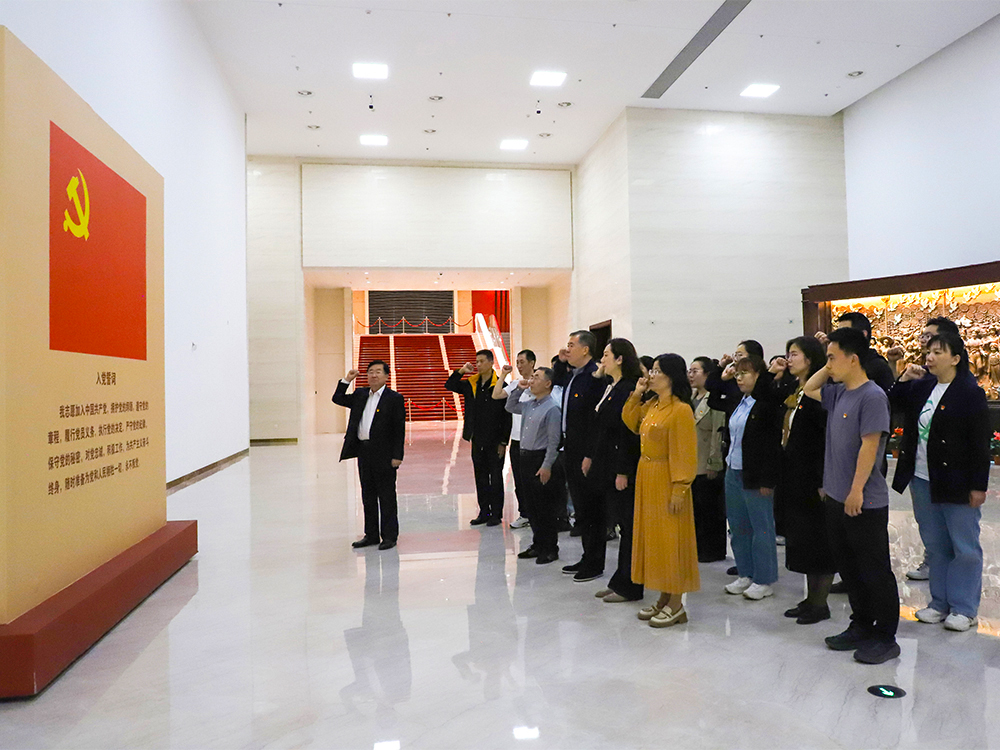 在宣誓厅,全体党员面向鲜红的党旗,举起右拳,重温入党誓词,重忆入党初心。