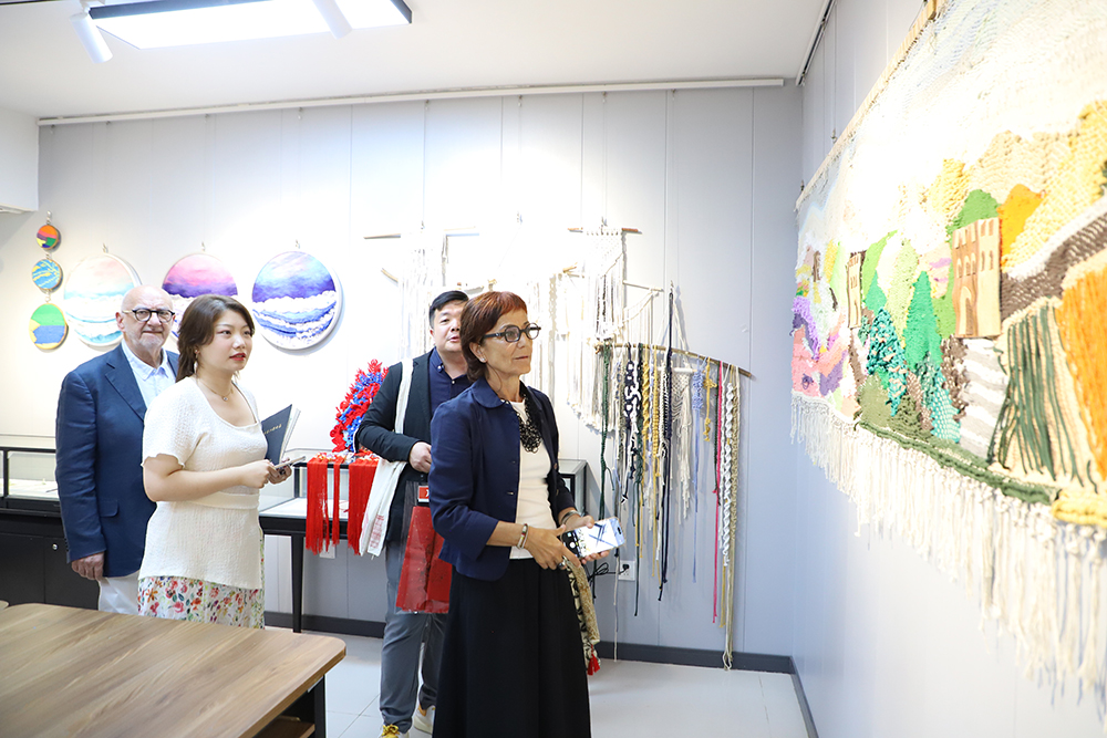 意大利代表团参观了工美创云直播工作室、内画艺术工作室、纤维艺术工作室、武强年画工作室、庞永辉国大师工作室、高英坡国大师工作室以及2025级视觉传达设计系的毕业设计创作展。Stefania di Marco教授对中国传统文化和工艺美术表现出浓厚的兴趣和热情,与我校师生进行了亲切交流。