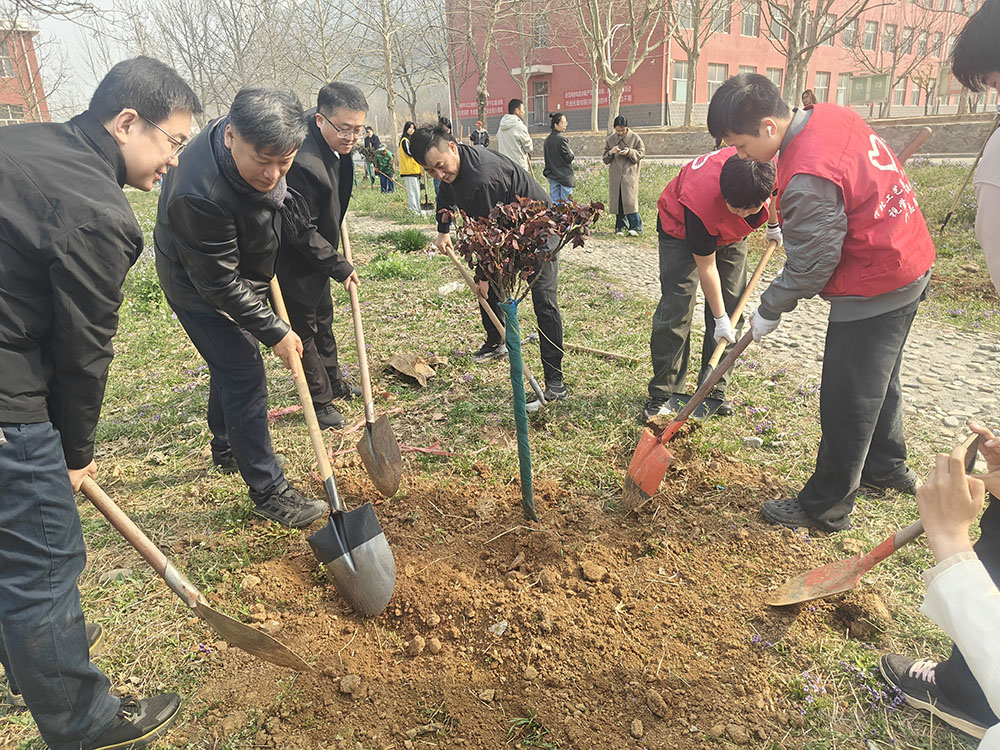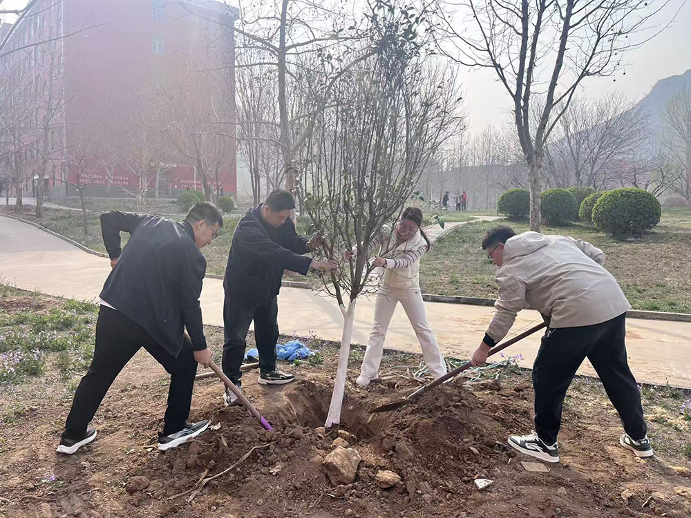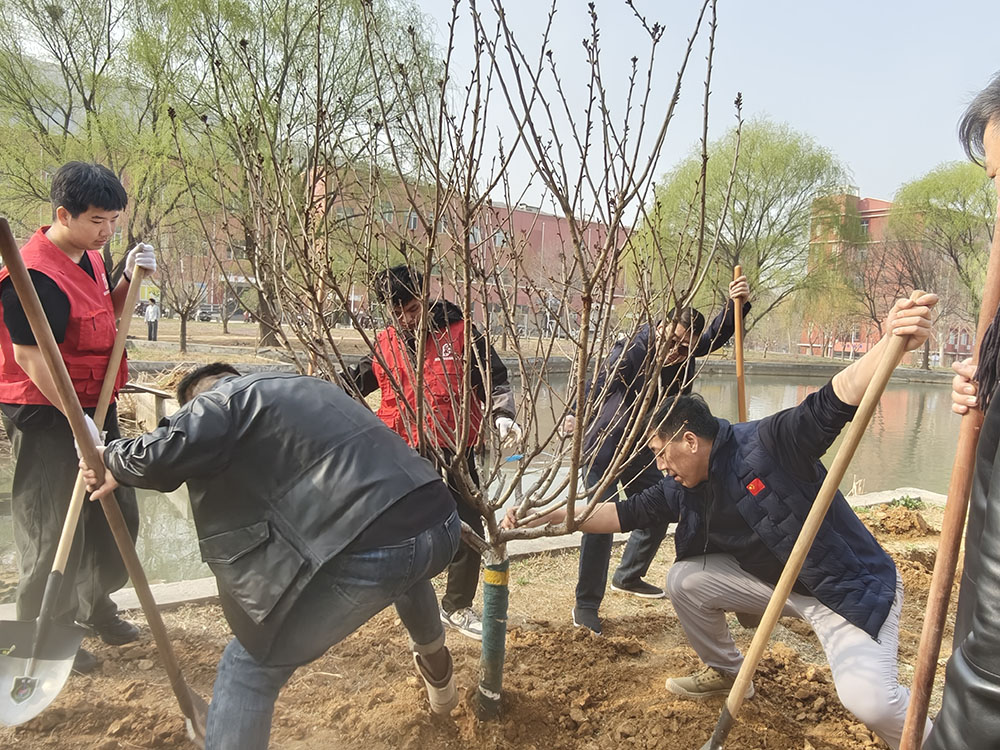 活动现场,师生们热情饱满、干劲昂扬。院领导率先垂范,与同学们并肩劳作,挖坑、扶苗、培土、浇水,每一步都细致认真。大家分工有序、配合默契,新植的金桂挺立风中,桃树与樱花错落相间,月季含苞待放,劳动的身影与点点新绿交织成春日校园里一幅生动的画卷,静候花香满园、绿意绵延。