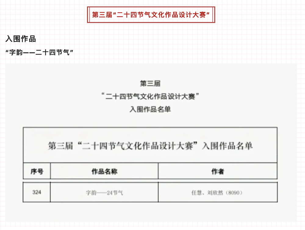 12月18日,由中国农业博物馆和北京市文物局共同主办的第三届“二十四节气文化作品设计大赛”参赛作品评选结果公示,我院教务处长任慧和视觉艺术系教师刘欣然老师设计的“字韵——二十四节气”在全国1957人/团体报送的13004件/套作品中脱颖而出,成功入选500件入围作品。