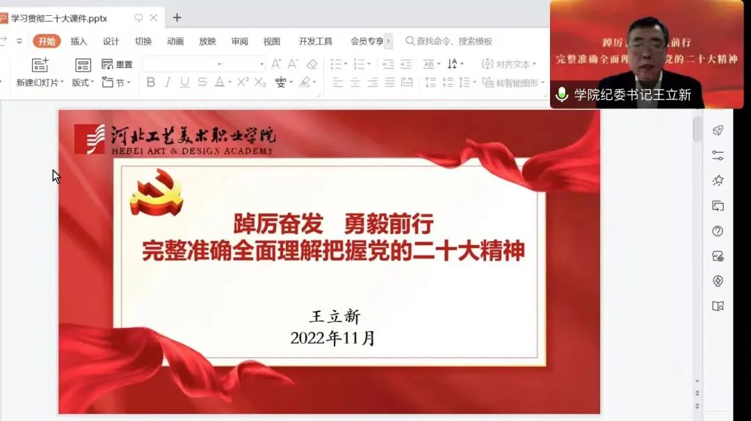 为进一步落实深入学习宣传贯彻党的二十大精神的部署要求,11月30日下午15时,学院纪委书记王立新以“踔厉奋发勇毅前行——完整准确全面理解把握党的二十大精神”为题,结合学院学生工作实际和纪检监察工作,通过腾讯会议为视觉传达设计系师生和纪委委员、纪检委员同志,对党的二十大精神进行了系统阐述和深入解读。会议由视觉传达设计系党总支书记王培良主持。