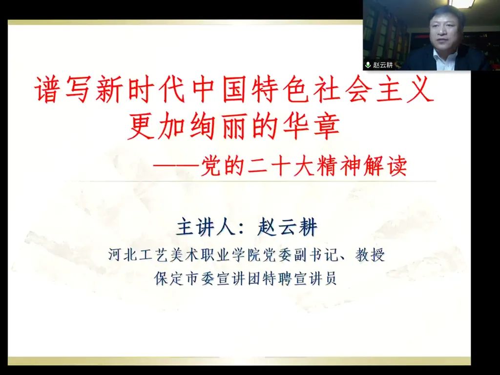 为深入学习宣传贯彻党的二十大精神,营造良好的学习氛围,学院党委副书记赵云耕以“谱写新时代中国特色社会主义更加绚丽的华章”为题,通过腾讯会议为美术系师生深入解读党的二十大丰富精神内涵。