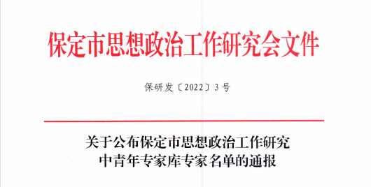 为提升保定市思想政治研究水平和质量,建立一支高素质的思想政治工作研究队伍,7月26日,保定市思想政治工作研究会印发了《关于公布保定市思想政治工作研究中青年专家库专家名单的通报》,我院党委副书记赵云耕作为省思想政治工作研究会特约研究员受聘担任保定市思想政治工作研究中青年专家库专家,聘期三年。