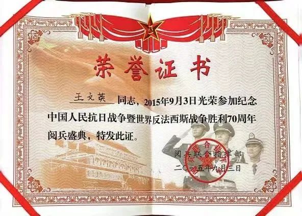 王文英同志如今已百岁高龄,1939年入党时她只有15岁,1938年抗战初期,王奶奶就带领村里的妇女为游击队战士做军鞋、缝衣服,负责后勤供应和管理工作,还担任了大庄、小庄、凤凰庄等多个村的妇联会主任,为抗战胜利做出了卓越的贡献。2015年9月王文英老同志光荣地参加了纪念中国人民抗日战争暨世界反法西斯战争胜利70周年阅兵盛典。