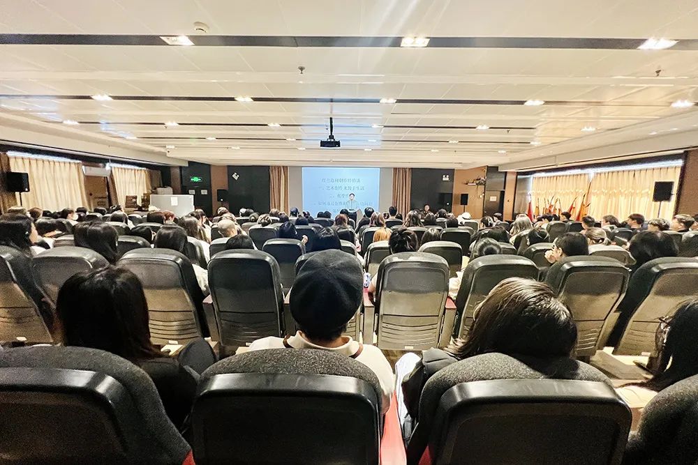 徐复生老师从艺术创作与生活的关系角度切入,通过对其创作并广受好评的十余幅红色题材画作的讲解,向师生畅谈了他对于革命题材、历史题材的创作体会和艺术探索心得。并结合个人求学经历,将著名版画家艾炎先生、著名画家黄胄先生、孙其峰先生以身示范,传艺解惑的点点滴滴与大家进行了分享。徐复生老师强调中国画是中国文化、美学思想、哲学观念的集中表现,具有独特的艺术魅力。中国画的创作是终身学习的过程,创作过程中要不断提高自身文化修养、艺术素养;画者必须要深入生活、投入感情,要用画笔描绘光辉的中华历史、伟大的中国人民、昂扬的新时代风貌,这样的创作才会产生审美共鸣、富有感染力。讲座结束,徐复生老师就绘画教学、创作等问题与师生进行了互动交流,现场气氛热烈。