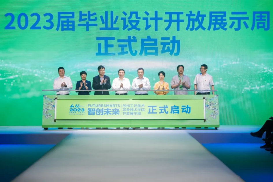 在活动中张广军院长同江苏省人力资源和社会保障厅巡视员余强,江苏省主题教育第二十巡回指导组副组长、南京林业大学党委副书记、副校长刘中亮、苏州市文化广电和旅游局局长韩卫兵、江苏省服装协会会长龚慧娟、苏州市妇联副主席唐学芳、苏州市教育局职业教育处处长沈文和苏州工艺美术职业技术学院校党委书记范卫东共同启动苏州工艺美术职业技术学院“智创未来”2023届毕业设计开放展示周。