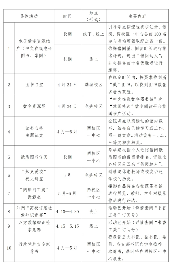 芳菲春日无限好,最美人生书中来。在第29个“世界读书日”来临之际,图书馆将以“春暖花开日 正是读书时”为主题开展读书月活动,以此激发读者阅读兴趣,培养良好的阅读习惯,在校园内形成爱读书、读好书、善读书的浓厚氛围,推进校园文明和书香校园的建设。