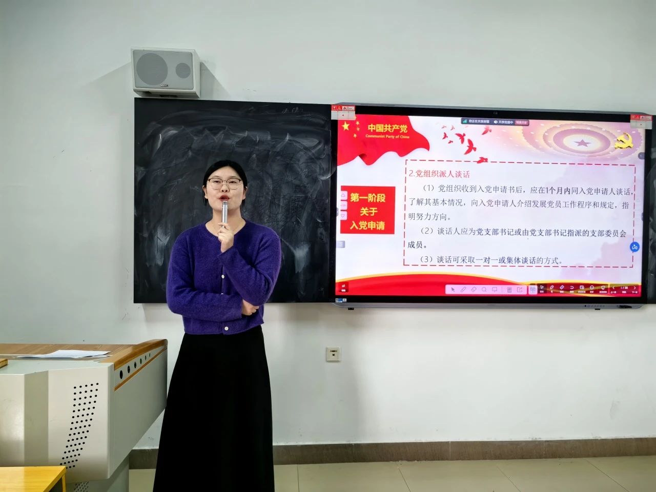 闫嘉兴围绕着入党的5个阶段、25个步骤进行了详细的讲解,向同学们介绍了发展党员的程序。她结合具体实际为大家讲解了入党申请书的撰写要求,同时要求同学们加强同党组织的联系,增强组织观念,及时向党组织汇报个人思想、学习和工作情况,充分激发了同学们积极向党组织靠拢的热情和动力。