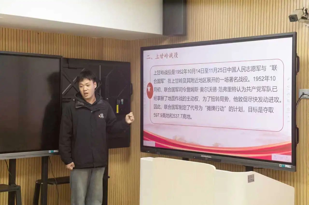 随后,武钰淇同学为大家讲解抗美援朝经典战役,并通过观看视频,带领大家重温了那段艰苦卓绝的峥嵘岁月。