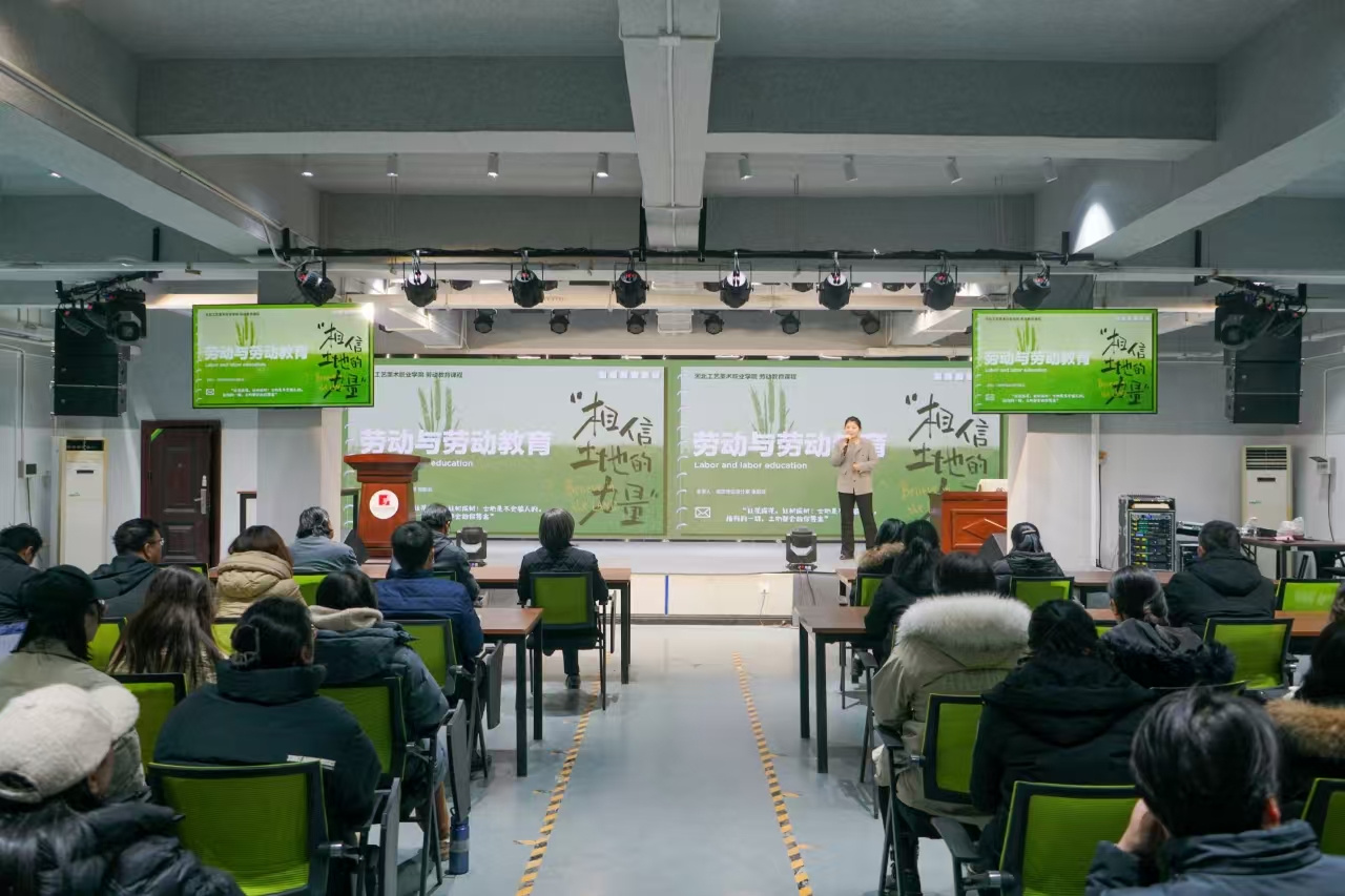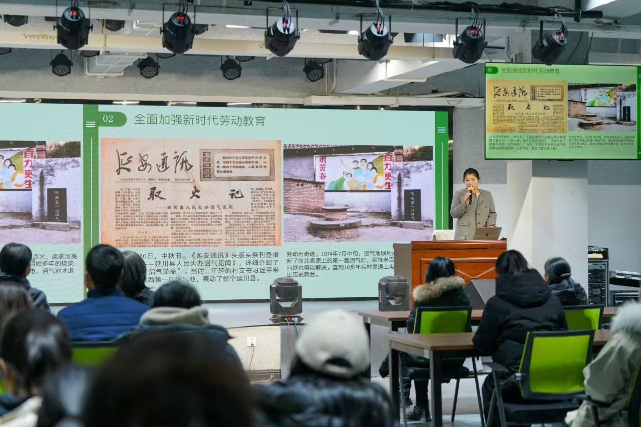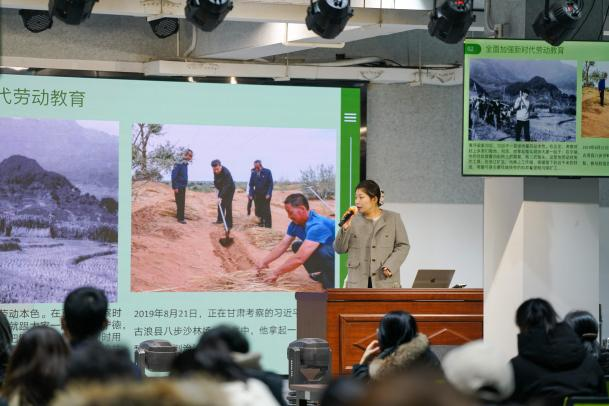 随后,张老师讲述习近平总书记在党的十八大以来提出的一系列关于劳动教育的新思想、新观点、新论断,讲解劳动教育的重要理论意义和实践价值。张老师通过讲述习总书记在陕西梁家河插队的劳动经历,向在场师生生动展示了总书记的“劳动观”。并以热门综艺《种地吧》中少年们的故事为劳动实践案例,让师生们看到了新时代青年在劳动中的朝气与活力。