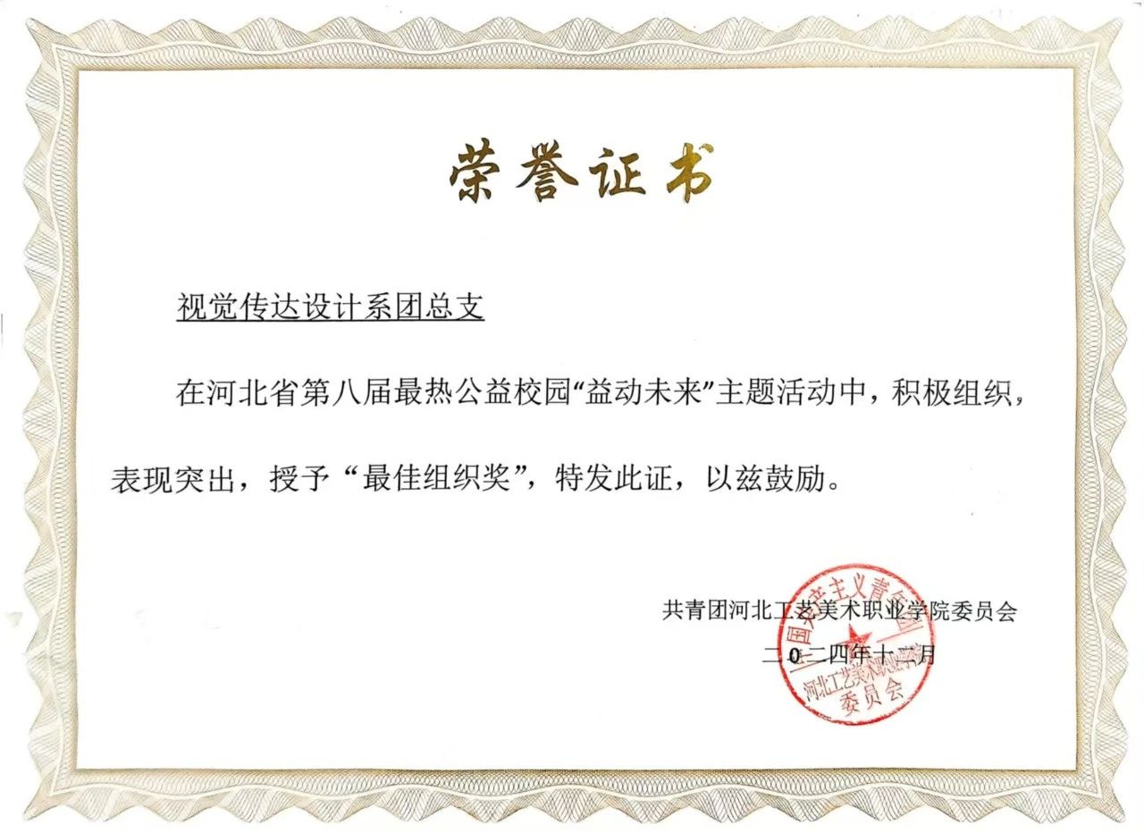 近日,由“志愿汇”平台举办的“青春建功新时代·数智启航志愿行”第八届最热公益校园“益动未来”主题活动评选结果揭晓,视觉传达设计系团总支荣获校内最佳组织奖。
