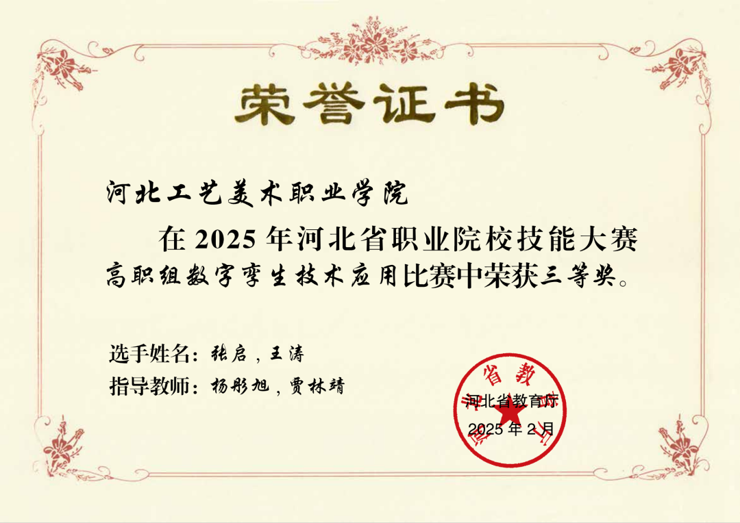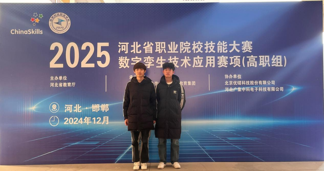 2024年12月27日,2025年河北省职业院校技能大赛高职组“数字孪生技术应用”赛项在邯郸科技职业学院举行。由视觉传达设计系计算机2301班张启、王涛组成的团队代表河北工艺美术职业学院参赛。团队凭借出色的专业技能和卓越的团队合作精神,荣获三等奖。
