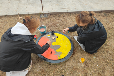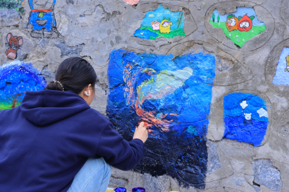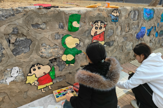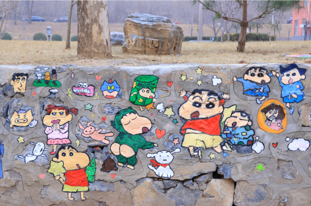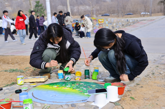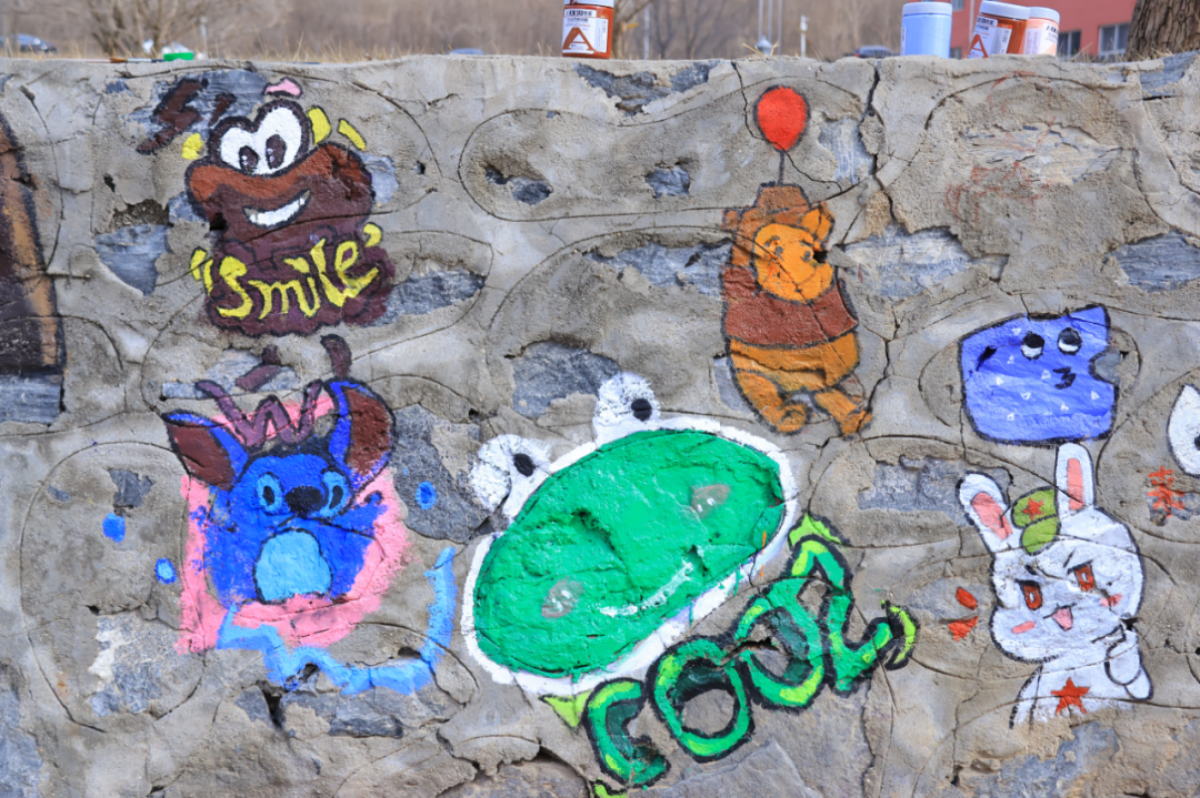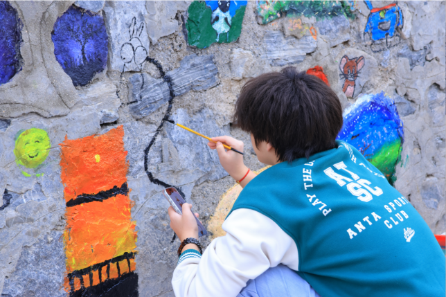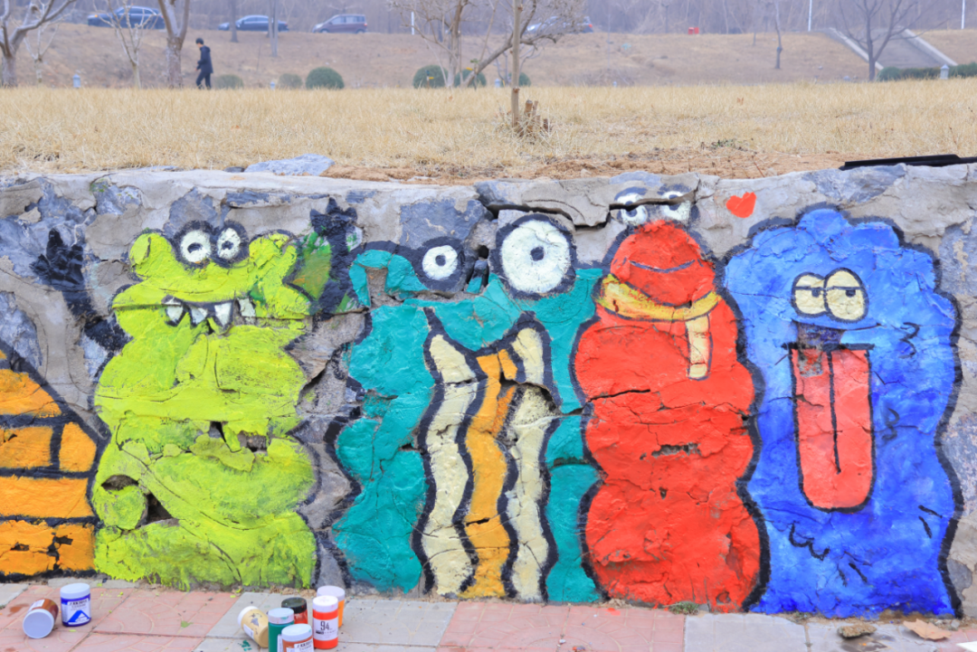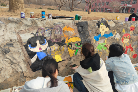 在实践部分,同学们以“绘美校园”为主题进行墙绘,融入潮流文化元素,引导学生从构图、色彩、符号语言等角度进行创意设计。学生们通过分组协作,最终形成了40余幅兼具艺术性与思想性的设计方案。
