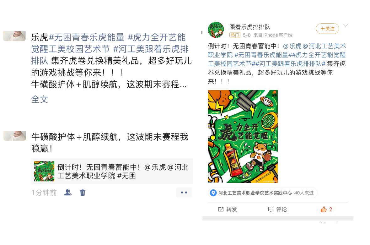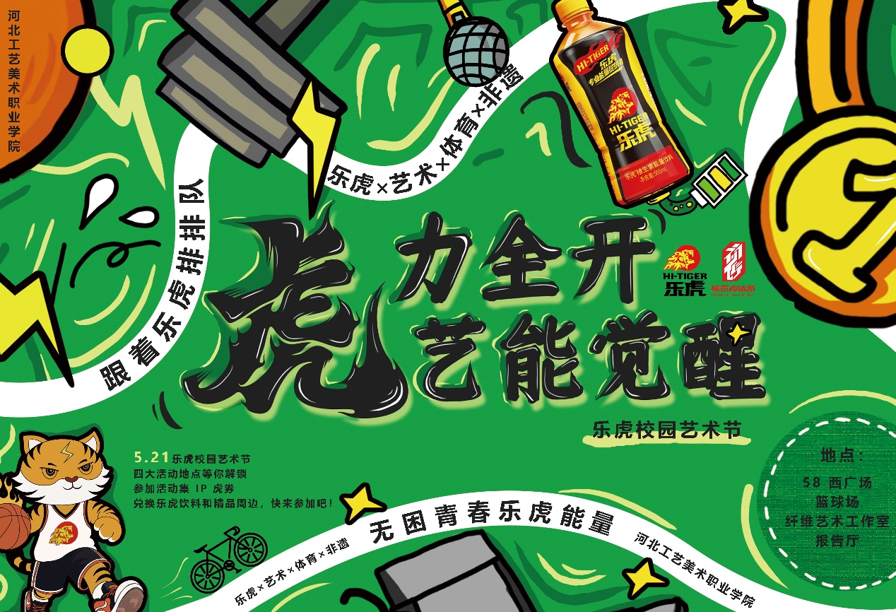 微博参与#无困青春乐虎能量# #虎力全开艺能觉醒工美校园艺术节# #河工美跟着乐虎排排队并@乐虎@河北工艺美术职业学院,发布校园乐虎活动宣传海报!为无困青春蓄能!