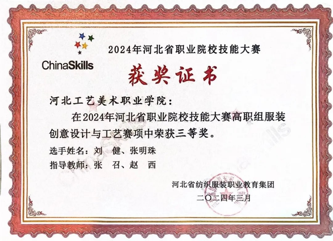 我系服装与服饰设计专业的刘健、张明珠同学,在2024年河北省职业院校技能大赛高职组服装创意设计与工艺赛项中,荣获三等奖。