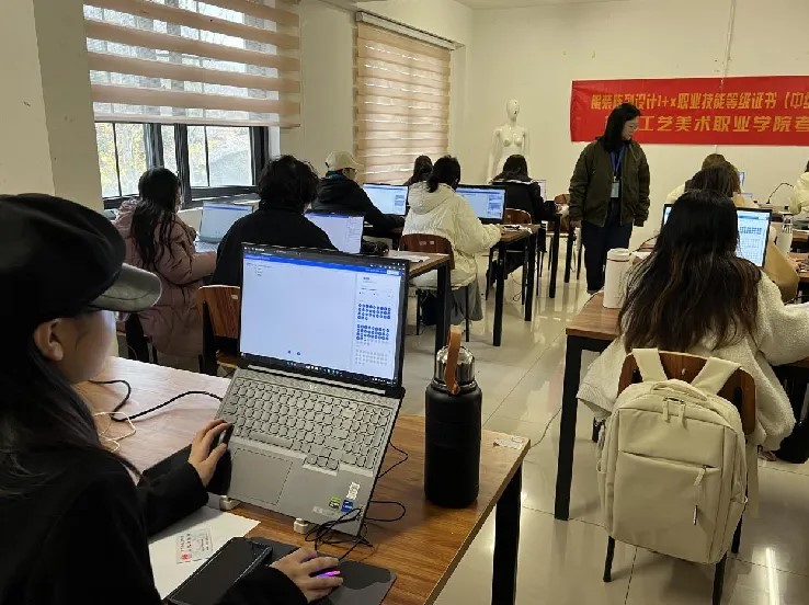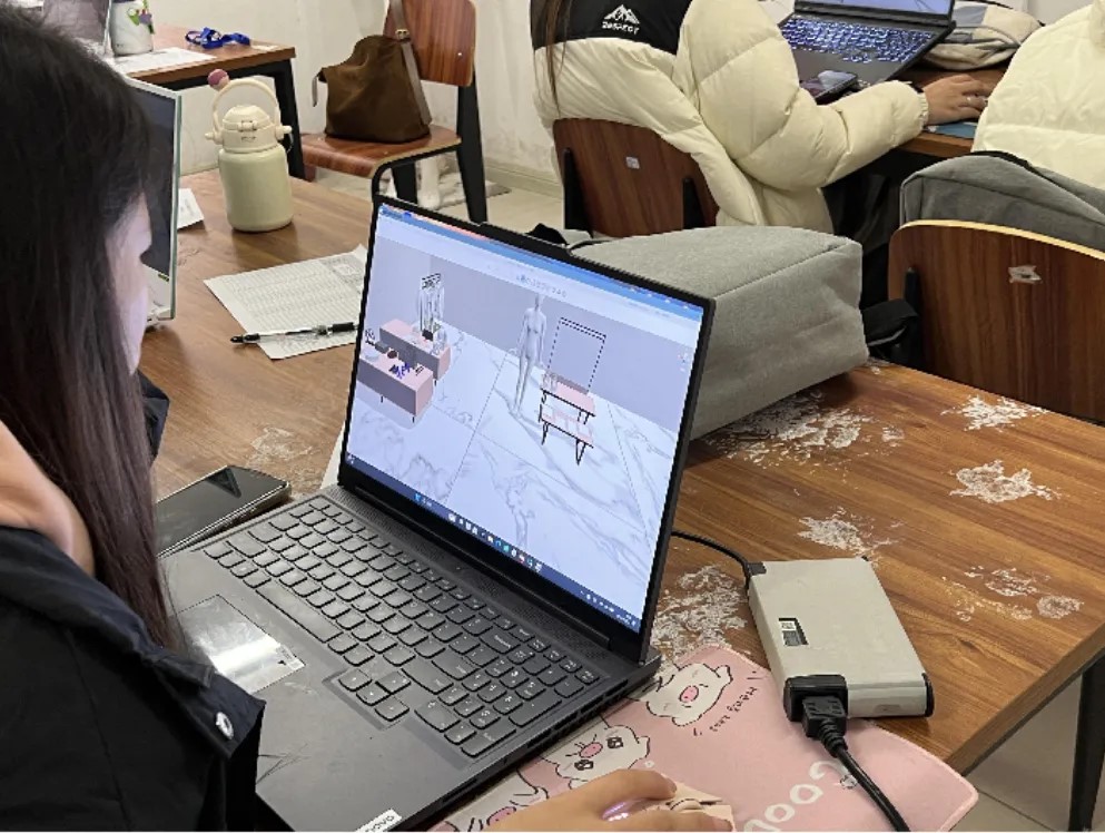 本次考试共有20名学生参加,分为理论机考和实操考试两个部分,全面考查学生们的专业理论知识与实际应用能力。机考部分在3D虚拟设计软件中进行,要求学生运用数字化工具进行创意设计,这不仅帮助学生掌握行业前沿技术,也使评委能从多个角度全面评估学生的设计理念。