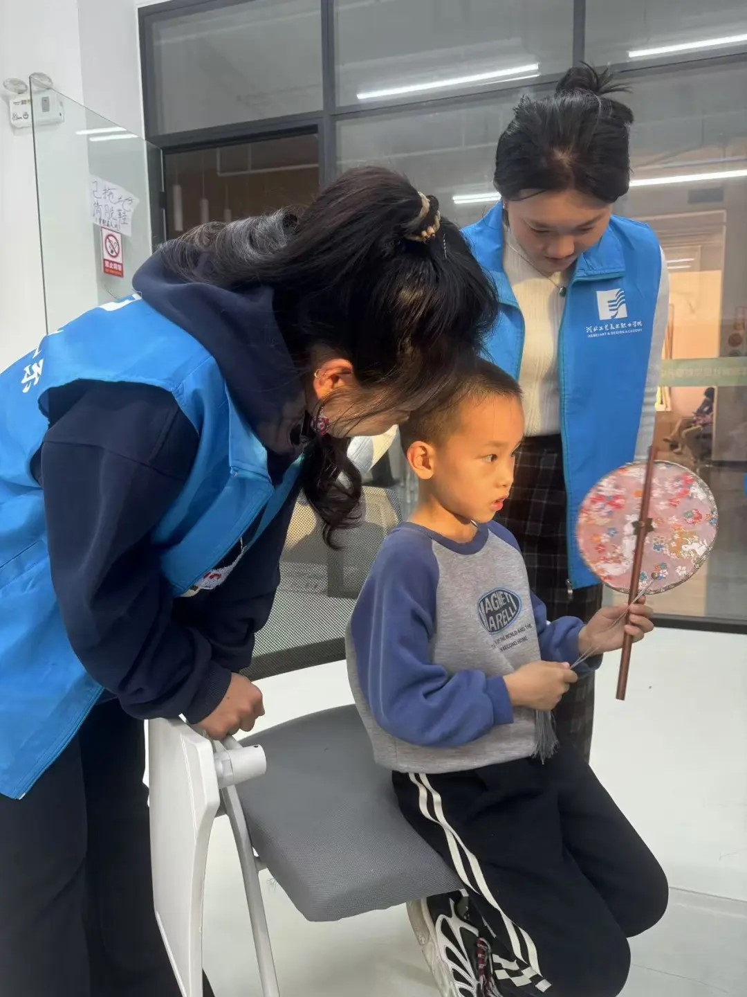 在手工制作环节,色彩斑斓的流苏丝线、精美的扇面材料以及各种装饰小物件整齐地摆放在桌面上,等待着小朋友用他们的巧手和创意赋予其新的生命。小朋友们迫不及待地拿起材料,纷纷化身小小艺术家,在志愿者学生的带领下,一把把古风古韵、美轮美奂的腰扇在孩子们手中诞生了。