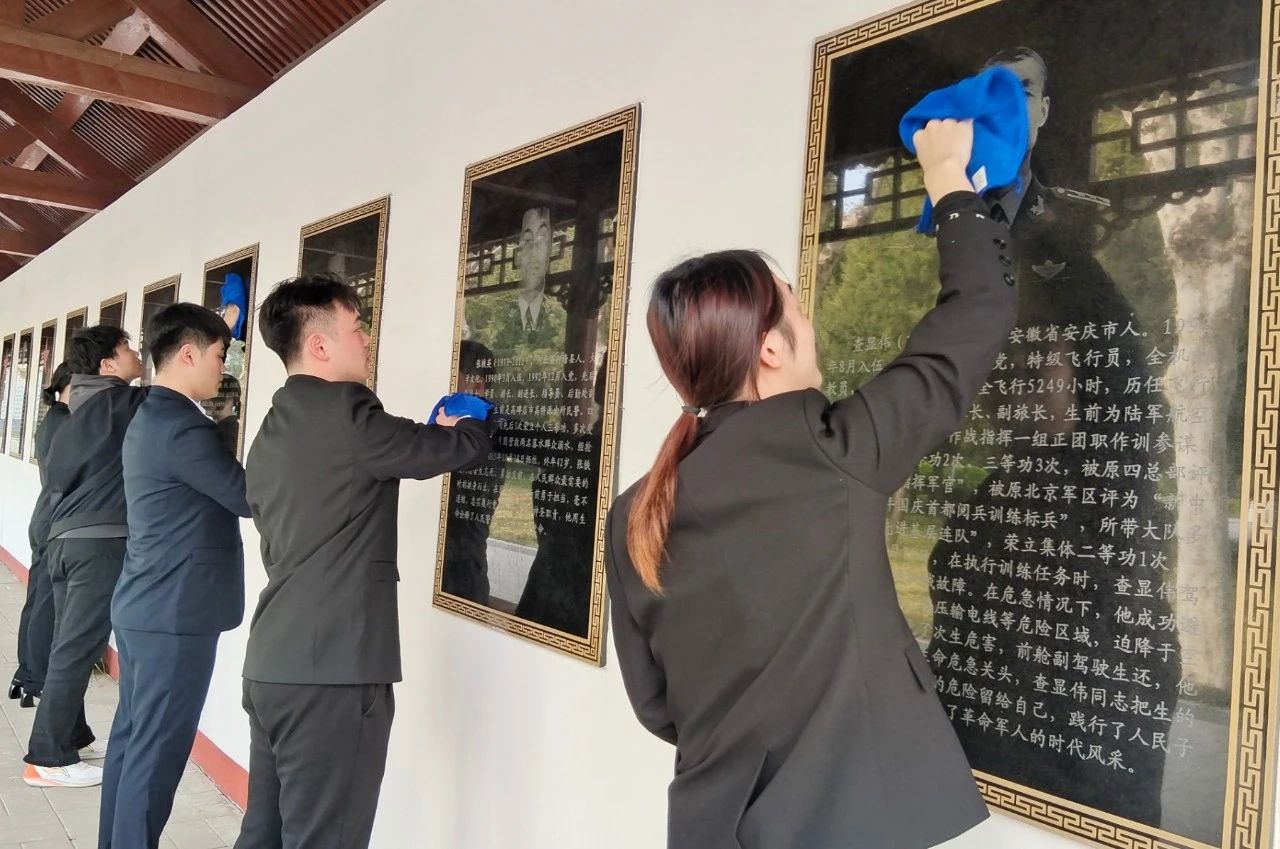 师生们动作轻柔且庄重地仔细擦拭墙上的英烈事迹展板,仿佛在拂去时光的尘埃,让那些不朽的英勇过往再度焕发光芒。