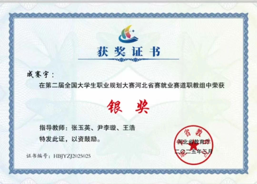 时尚工艺系学生成赛宇凭借清晰的职业规划、高度契合的实际行动与目标成果,斩获第二届全国大学生职业规划大赛河北省就业赛道职教组银奖。