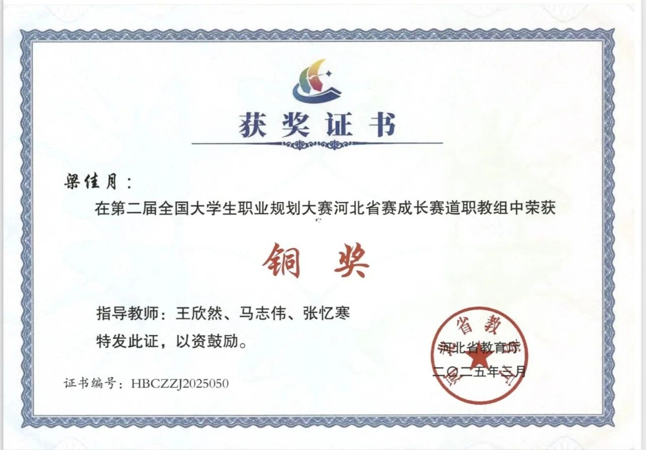 时尚工艺系学生梁佳月凭借出色的职业规划能力与现场表现,获得第二届全国大学生职业规划大赛河北省成长赛道职教组铜奖。